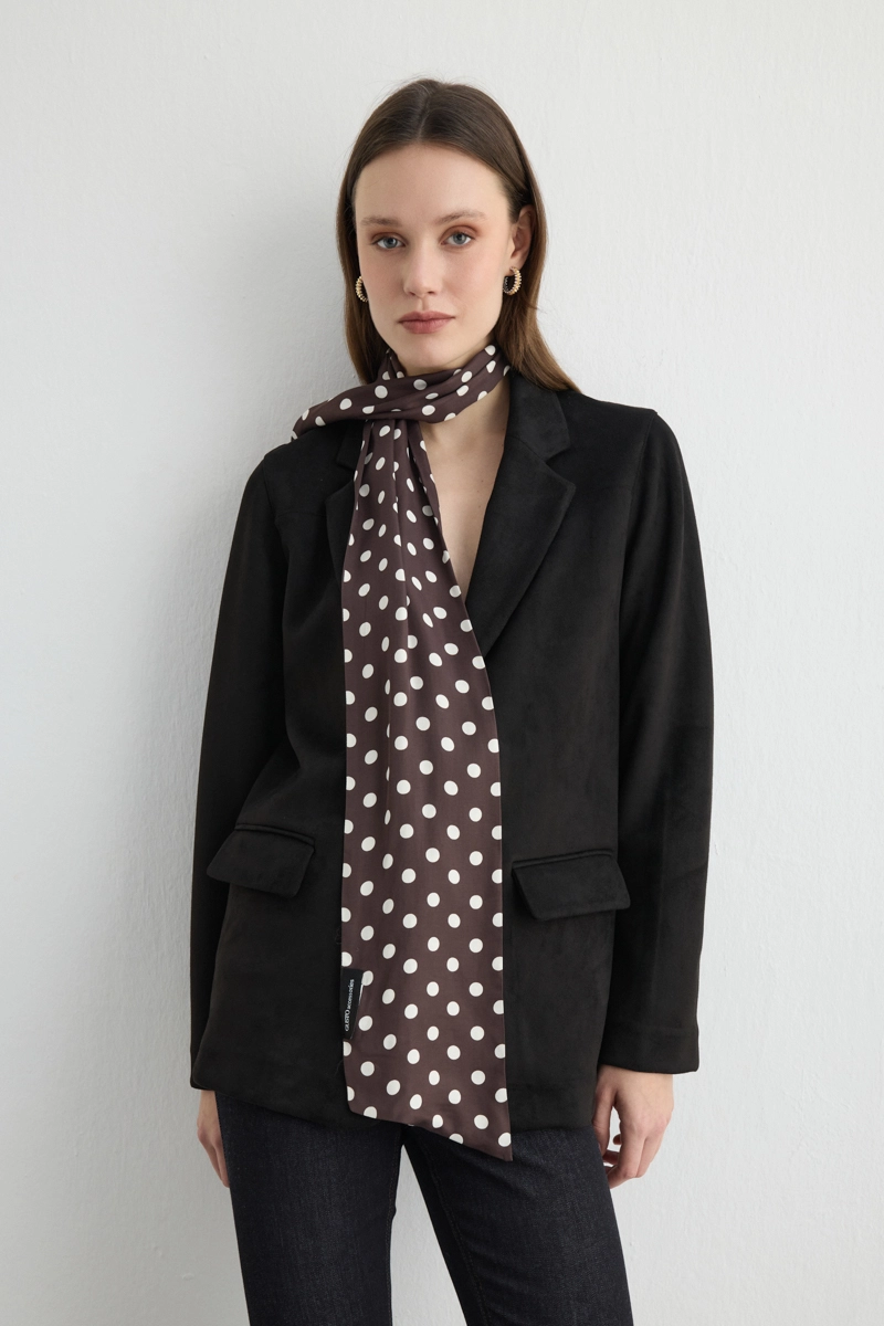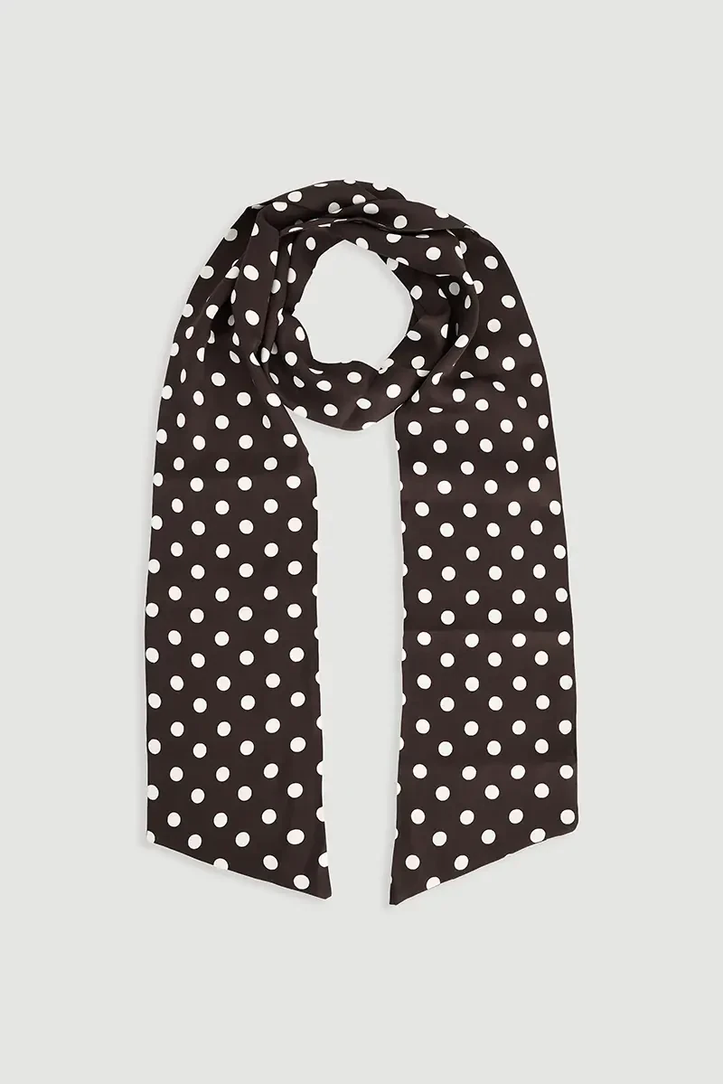 Puantiyeli deseniyle klasik stile enerjik bir dokunuş katıyor. Yumuşak dokusu ve uzun formu farklı bağlama stillerine olanak tanıyor. Gündelik kombinlere zarif bir detay eklemek için ideal bir aksesuar.
