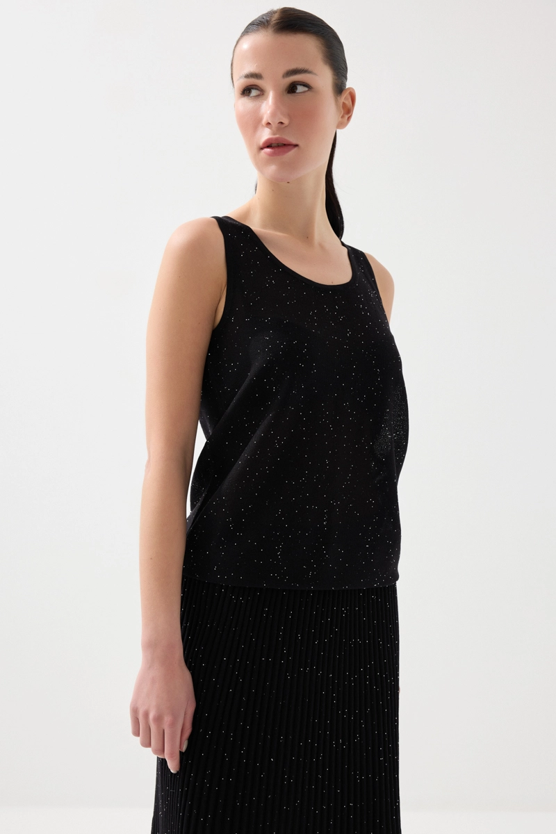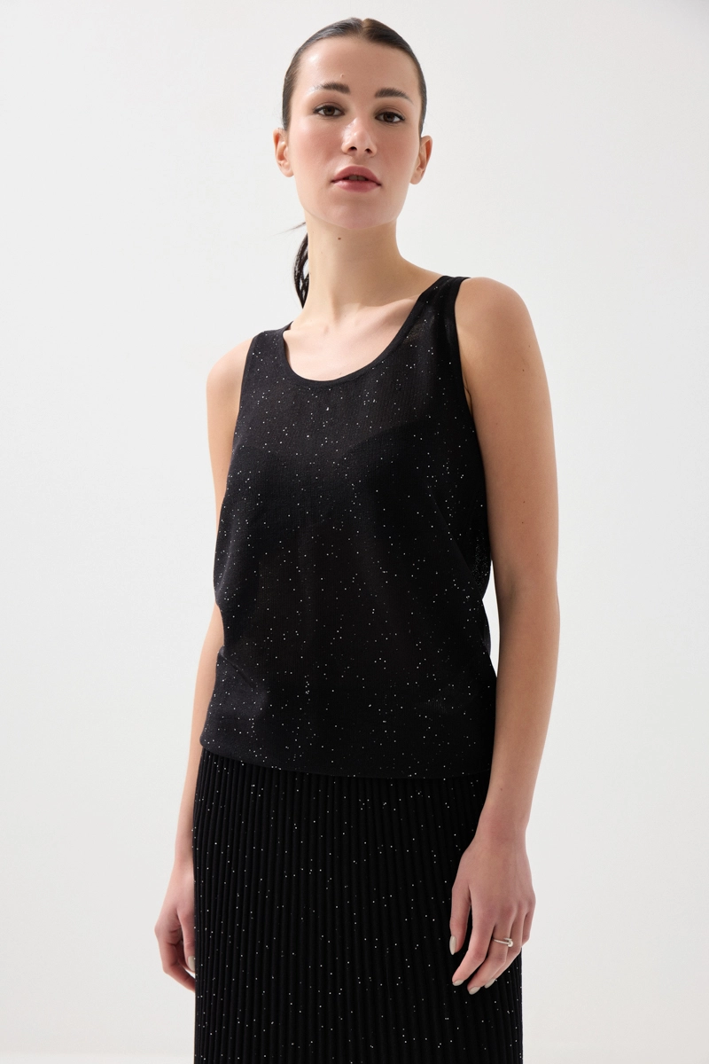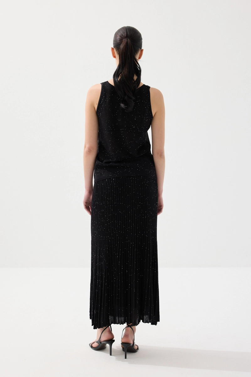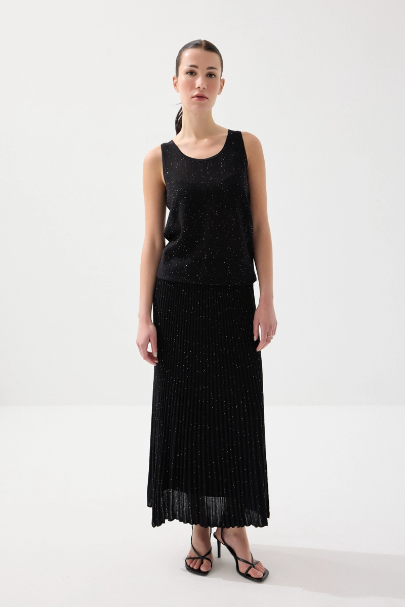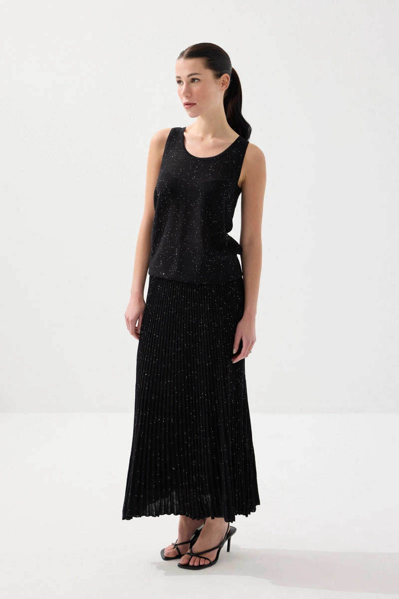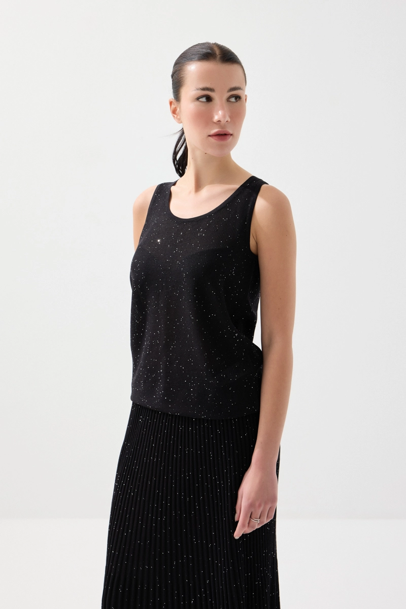 Parlak detaylarıyla sade tasarıma hareket kazandırır. Triko dokusu sayesinde yumuşak ve rahat bir kullanım sunar. Siyah tonu ile güçlü ve şık bir görünüm sağlar. Farklı parçalarla kolayca kombinlenebilir. Günlük ve şık kombinler için ideal bir tamamlayıcıdır.