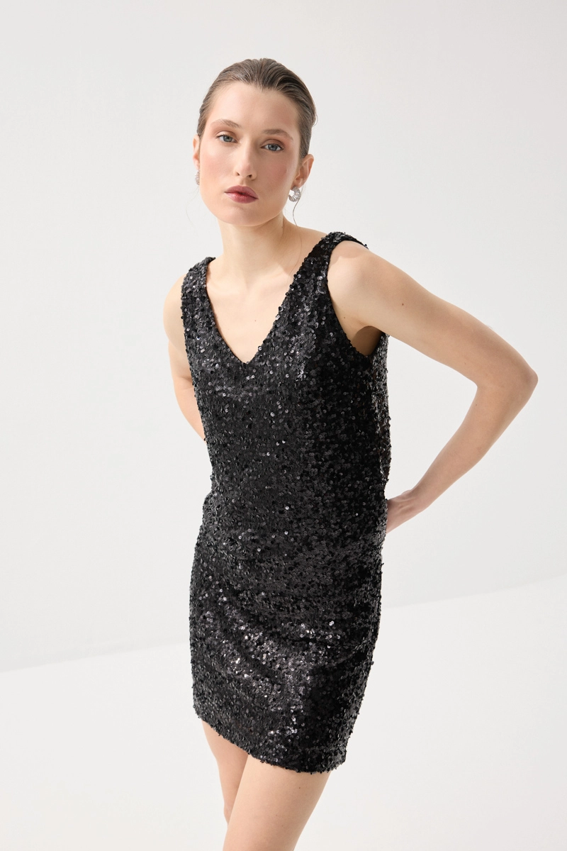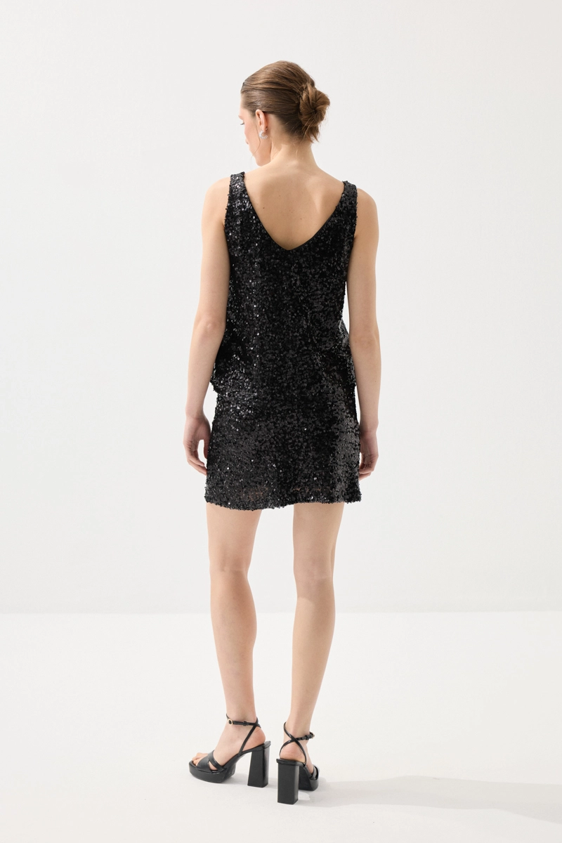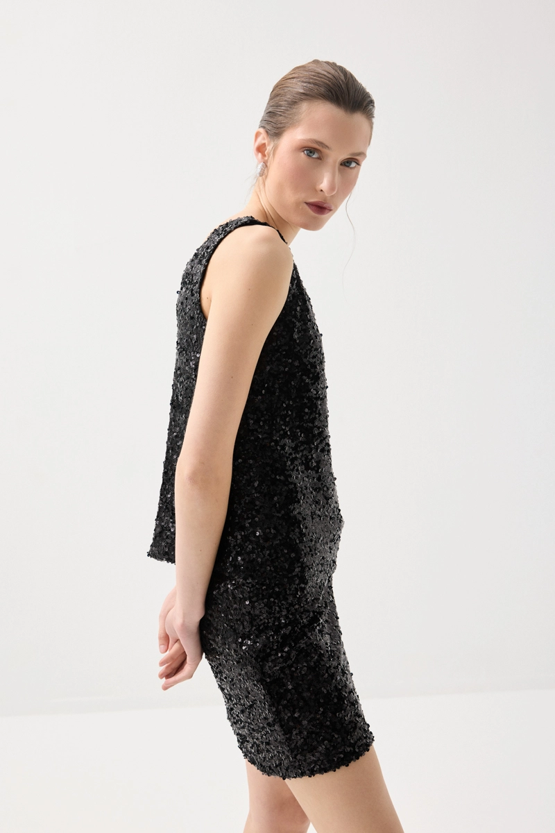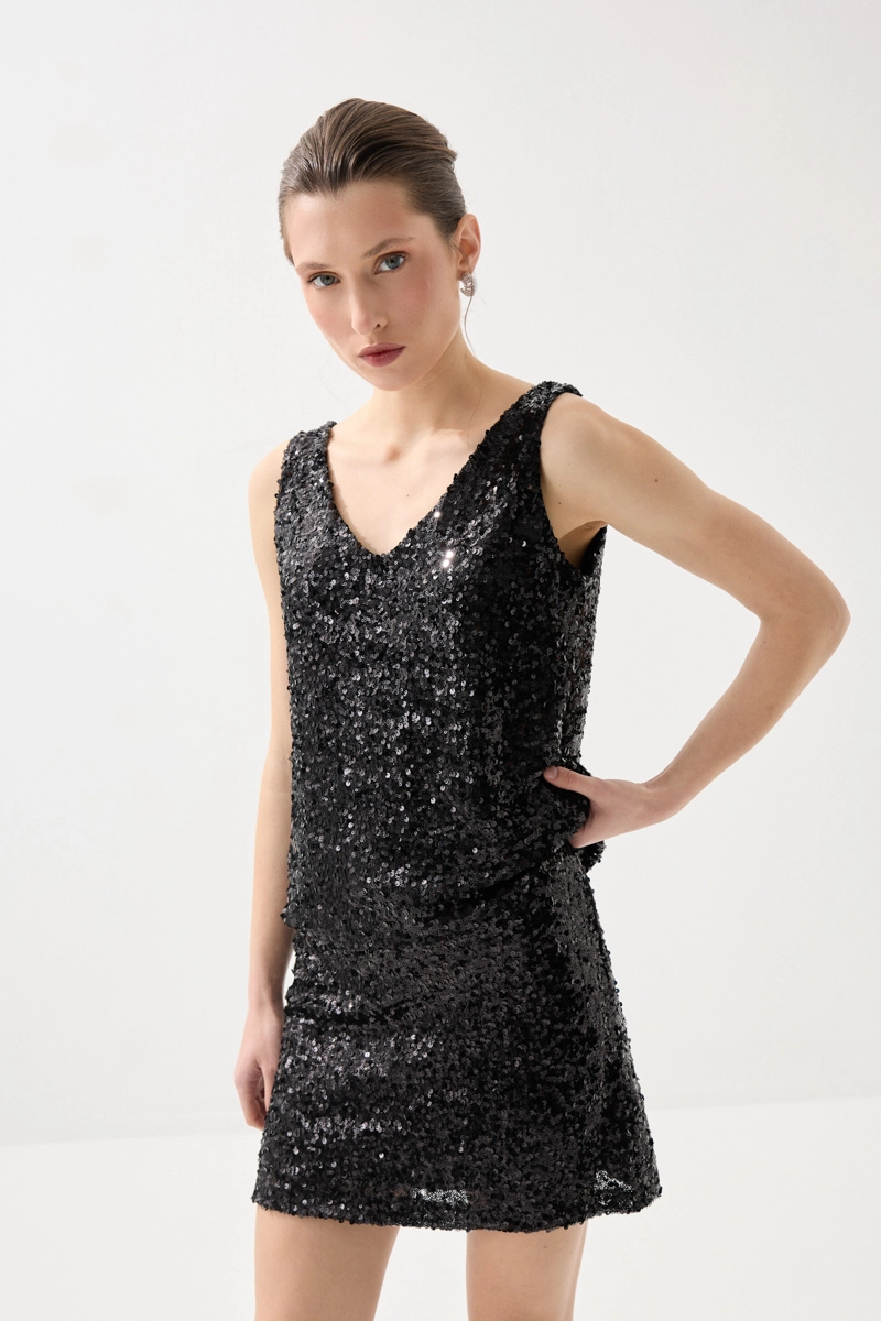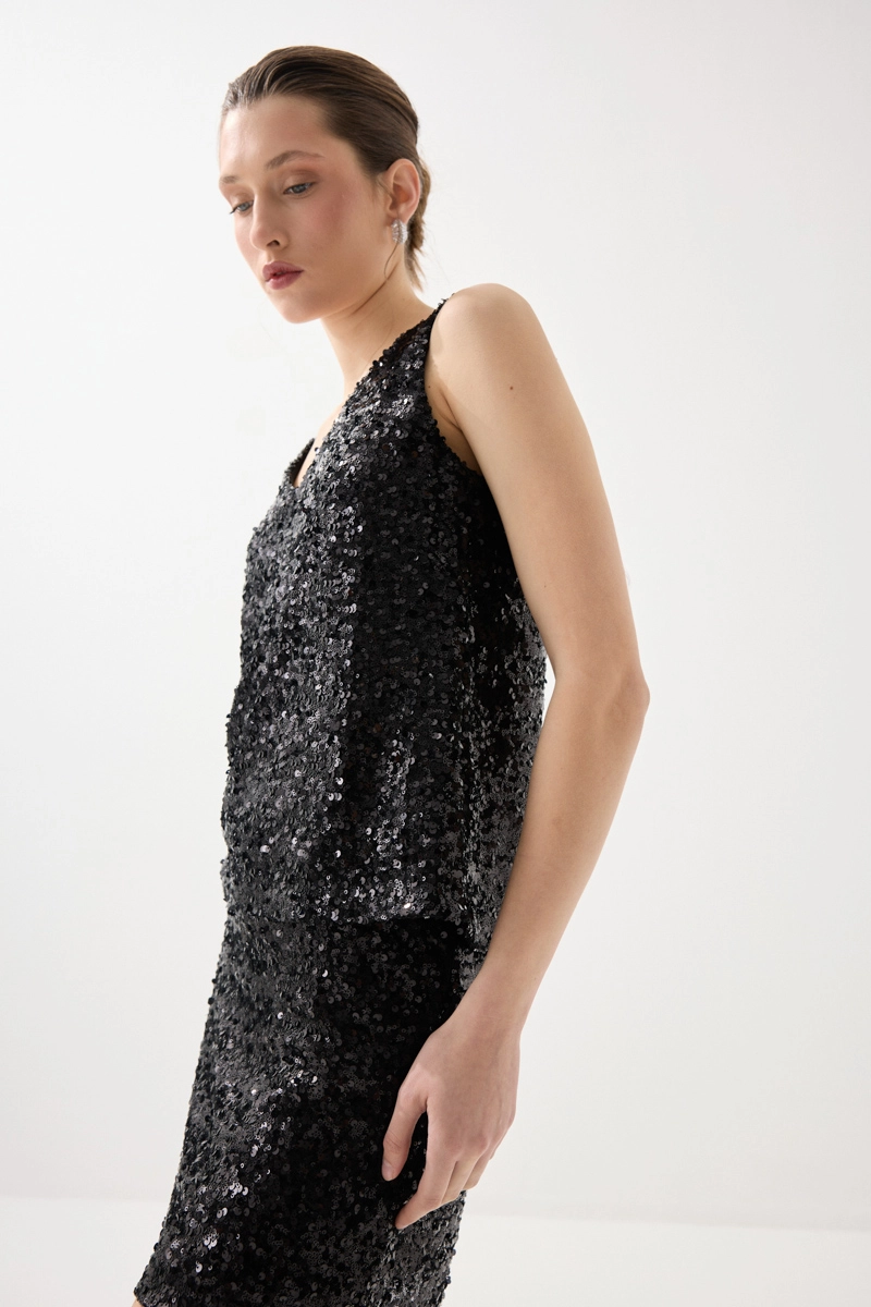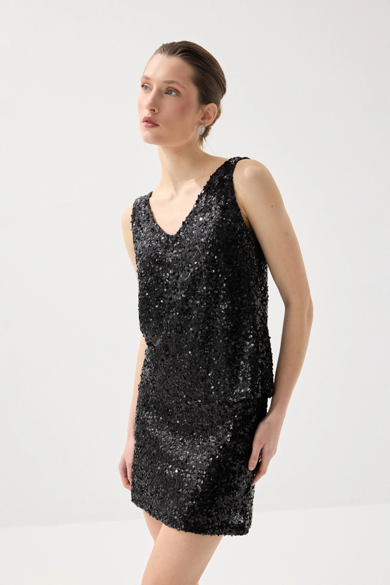 Pul payet detaylarıyla ışıltılı ve dikkat çekici bir görünüm sunar. Hafif yapısı sayesinde konforlu bir kullanım sağlar. Siyah rengiyle zamansız ve şık bir stil oluşturur. Özel davet kombinlerinin vazgeçilmez parçalarındandır.