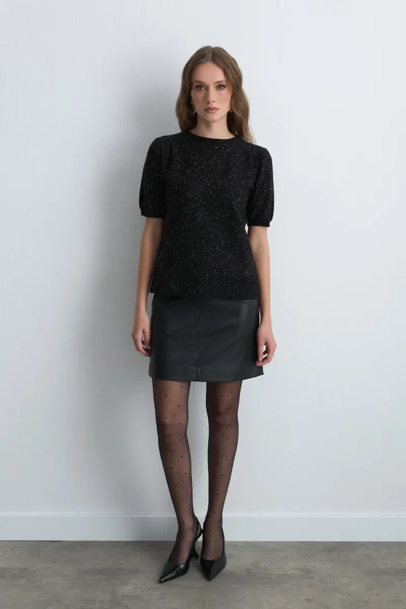Işıltılı pullarıyla dikkat çeken kısa kollu triko bluz, sade bir parçayı anında şık bir görünüme dönüştürür. Günlük kullanımdan akşam buluşmalarına kadar farklı ortamlara uyum sağlar. Rahat kesimi ve modern havasıyla dolabınızın kurtarıcı parçalarından biridir.