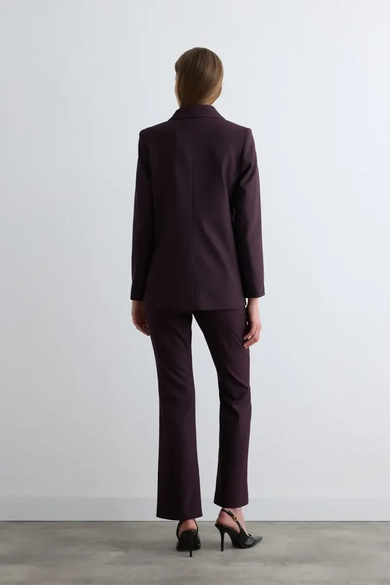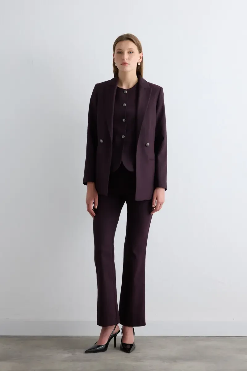 Rahat kesimi sayesinde gün boyu konfor sunar. Çizgili deseni modern ve güçlü bir duruş kazandırır. Mürdüm tonu sofistike bir hava katarak farklı kombinlerle uyum sağlar. Hem ofis hem günlük kullanım için şık bir alternatif oluşturur.