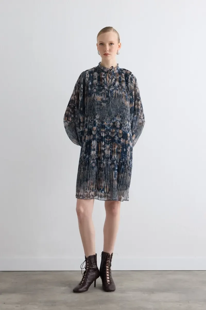 Hafif yapısıyla gün boyu konfor sağlar. Pilise detayı feminen bir görünüm kazandırır. Desenli yüzeyi dinamik bir hava katar. Lacivert tonu zamansız bir şıklık sunar. Hem günlük hem özel anlarda tercih edilebilir.