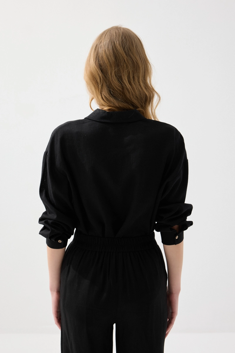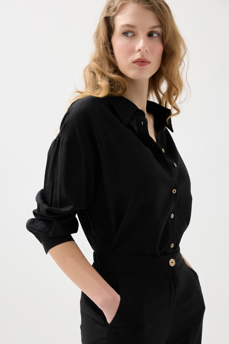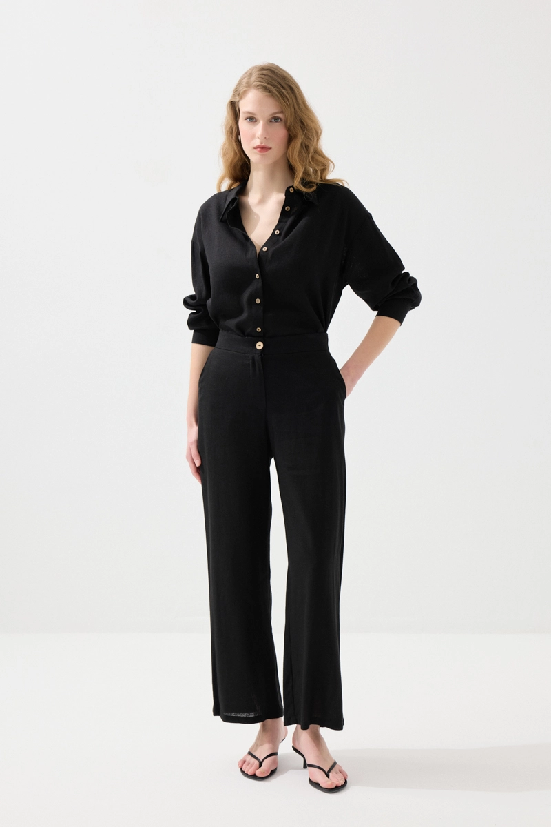 Klasik siyah tonu ile güçlü ve modern bir stil sunar. Keten dokusu sayesinde hafif ve konforlu bir kullanım sağlar. Rahat kesimi ile gün boyu rahatlık sunar. Günlük ve şık kombinlerle kolayca uyum sağlar. Zamansız bir tasarımdır.