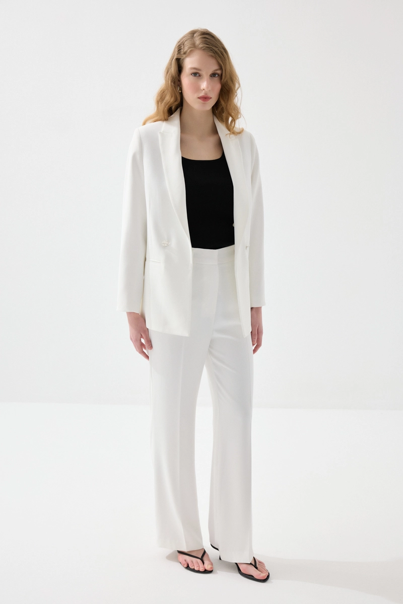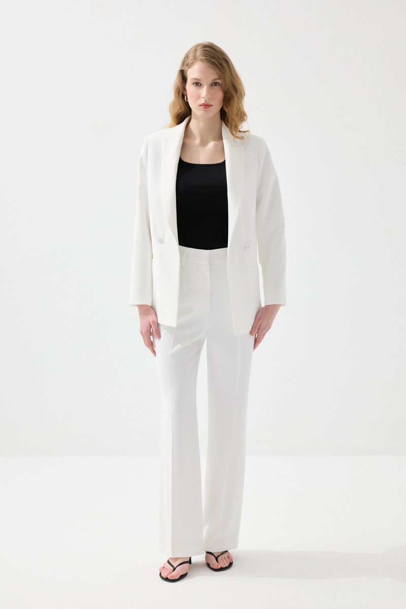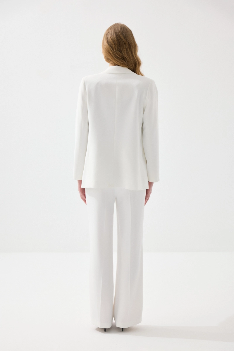 Akıcı krep dokusuyla zarif ve modern bir görünüm sunar. Rahat kesimi sayesinde konforlu bir kullanım sağlar. Beyaz tonu ile ferah ve şık kombinler oluşturur. Ofis stilinden günlük şıklığa kadar geniş kullanım sunar. Minimal tasarımıyla dikkat çeker.
