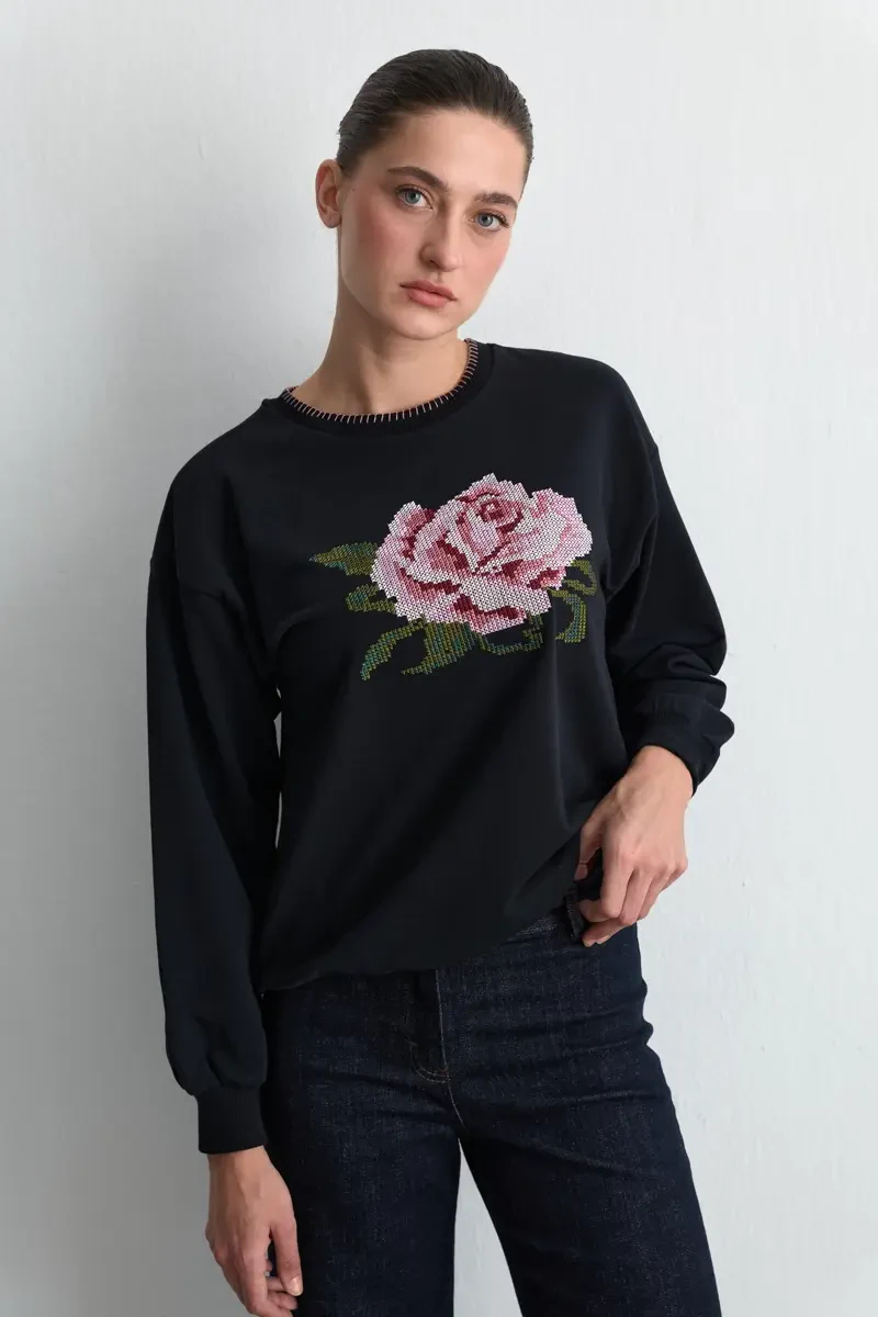 The rose embroidery adds a refined and romantic touch. Its black tone creates a simple and elegant base. The cotton texture offers softness and comfort. Its relaxed fit makes everyday wear effortless. A standout piece of modern, urban style.