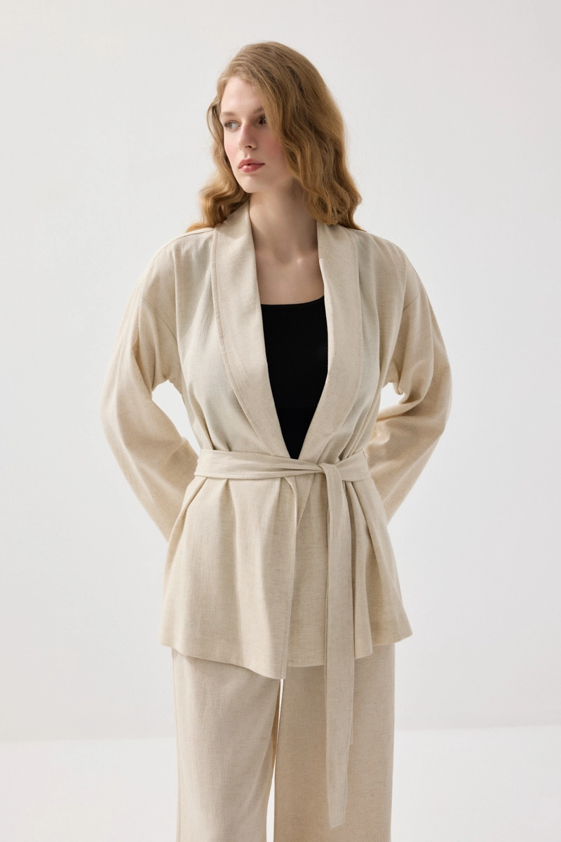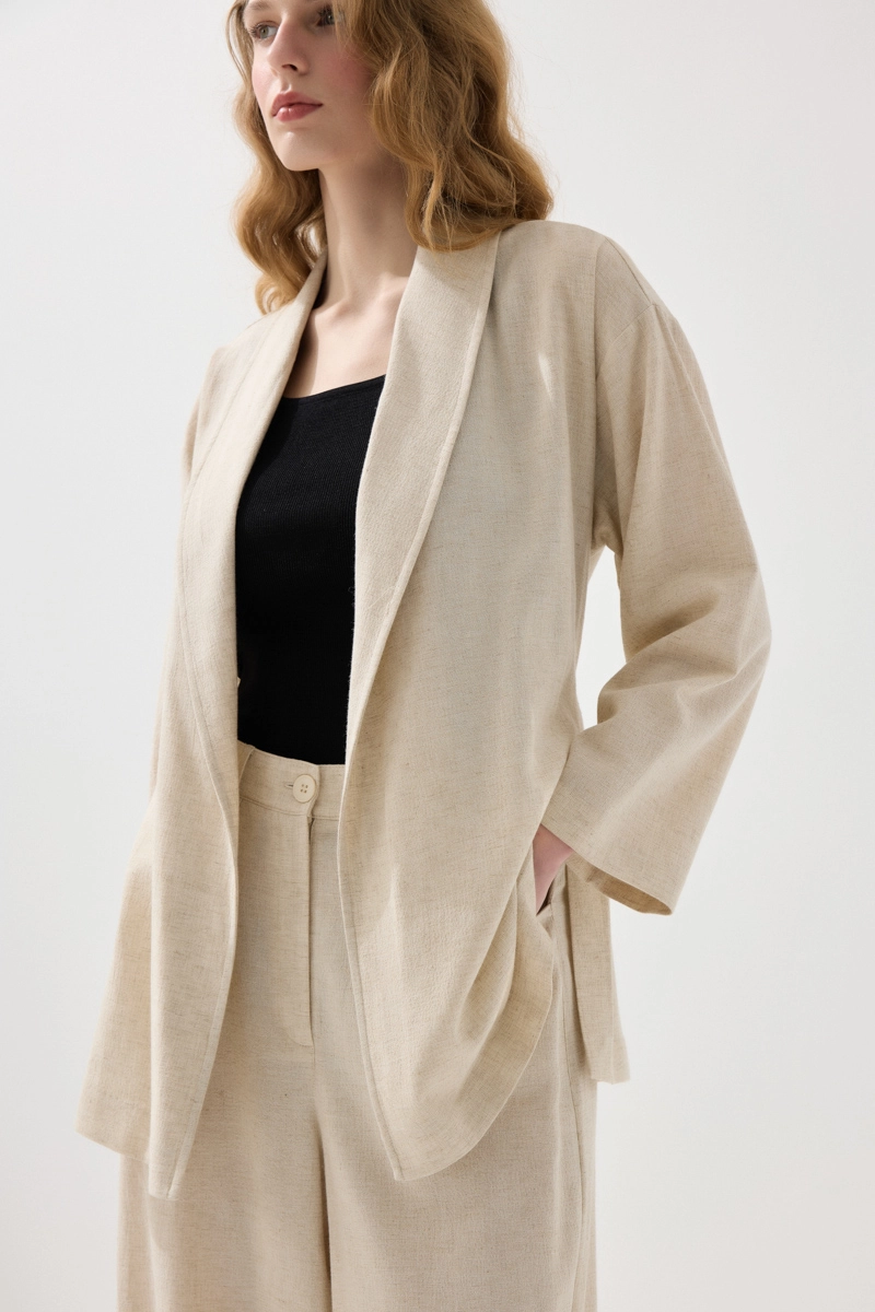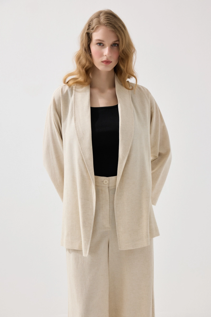 Akıcı kesimiyle zarif ve rahat bir stil sunar. Şal yaka detayı, tasarıma sofistike bir hava katar. Keten dokusu sayesinde hafif ve nefes alabilen bir kullanım sağlar. Bej tonu ile doğal ve sade bir görünüm oluşturur. Katmanlı kombinler için ideal bir tamamlayıcıdır.