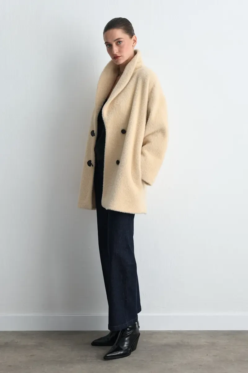 Peluş dokusu yumuşaklığıyla lüks bir konfor sunar. Şal yaka detayı zarif ve modern bir duruş kazandırır. Bej tonu doğal bir sıcaklık oluşturur. Oversize kesimi rahat bir görünüm sağlar. Soğuk havalarda hem şık hem de konforlu bir alternatif sunar.