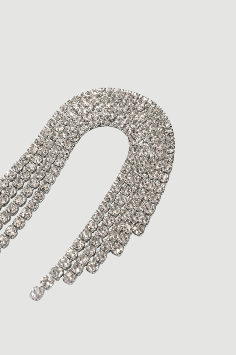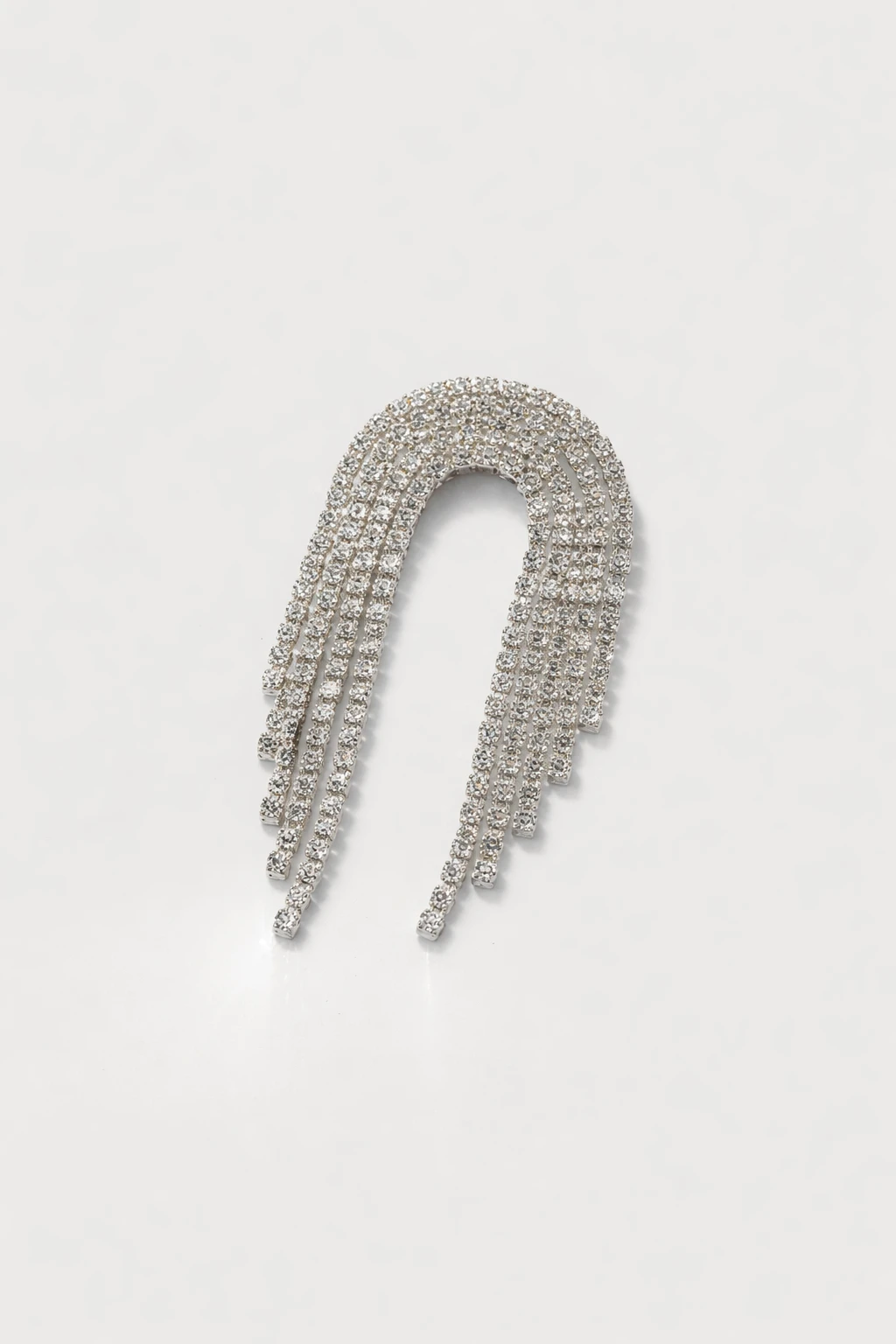 Parlak taş detaylarıyla zarif bir ışıltı sunar. Gümüş rengi sayesinde klasik ve modern stillerle uyum sağlar. Sallantılı formu hareketli ve dikkat çekici bir görünüm oluşturur. Ceket, palto ve şal kombinlerini şık şekilde tamamlar.