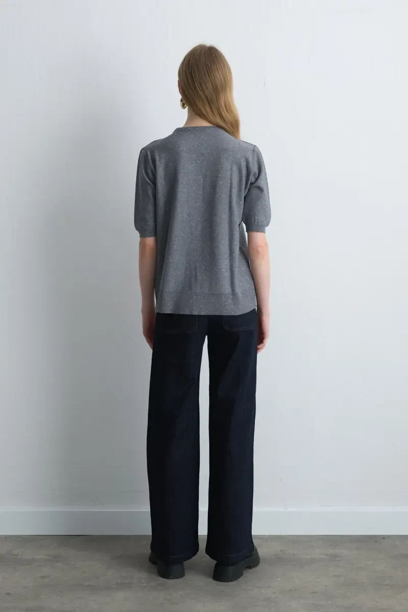 The grey short-sleeved knit blouse embellished with shimmering sequins offers a modern and chic option. Can be paired with simple bottoms for daytime or styled for evening events to create a striking elegance. Its soft knit texture provides comfortable wear.