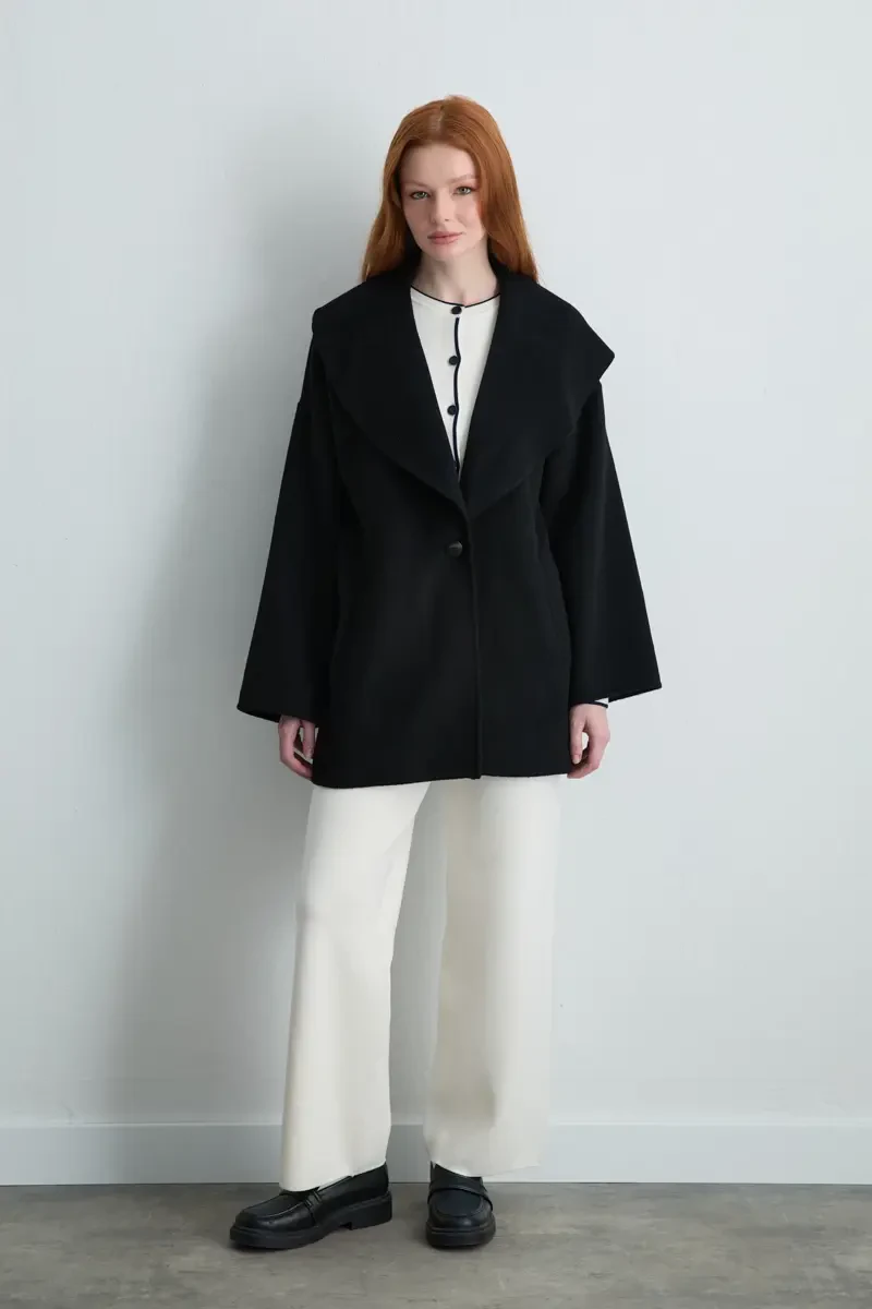 Shawl-collar coat in black offers a sophisticated look, with its unlined design providing lightweight and comfortable wear. Adds a modern touch to your style in both everyday and special outfits. Its soft texture keeps you warm during winter while maintaining elegance.