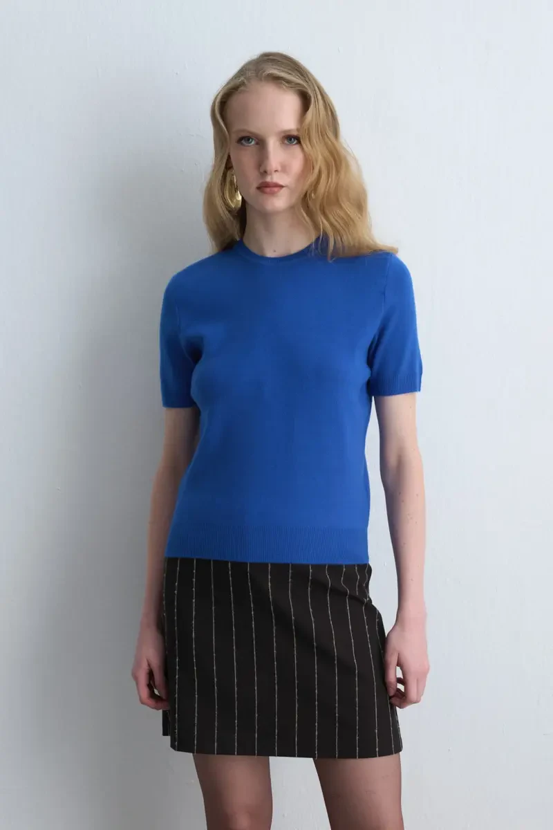This knit blouse, with a vibrant blue hue and short sleeves, provides a modern look while ensuring comfort in daily outfits. Its lightweight fabric and classic cut allow easy coordination with various bottoms. Its simple design appeals to every style.