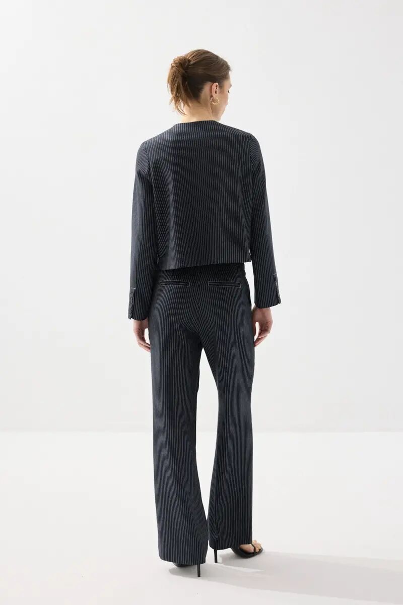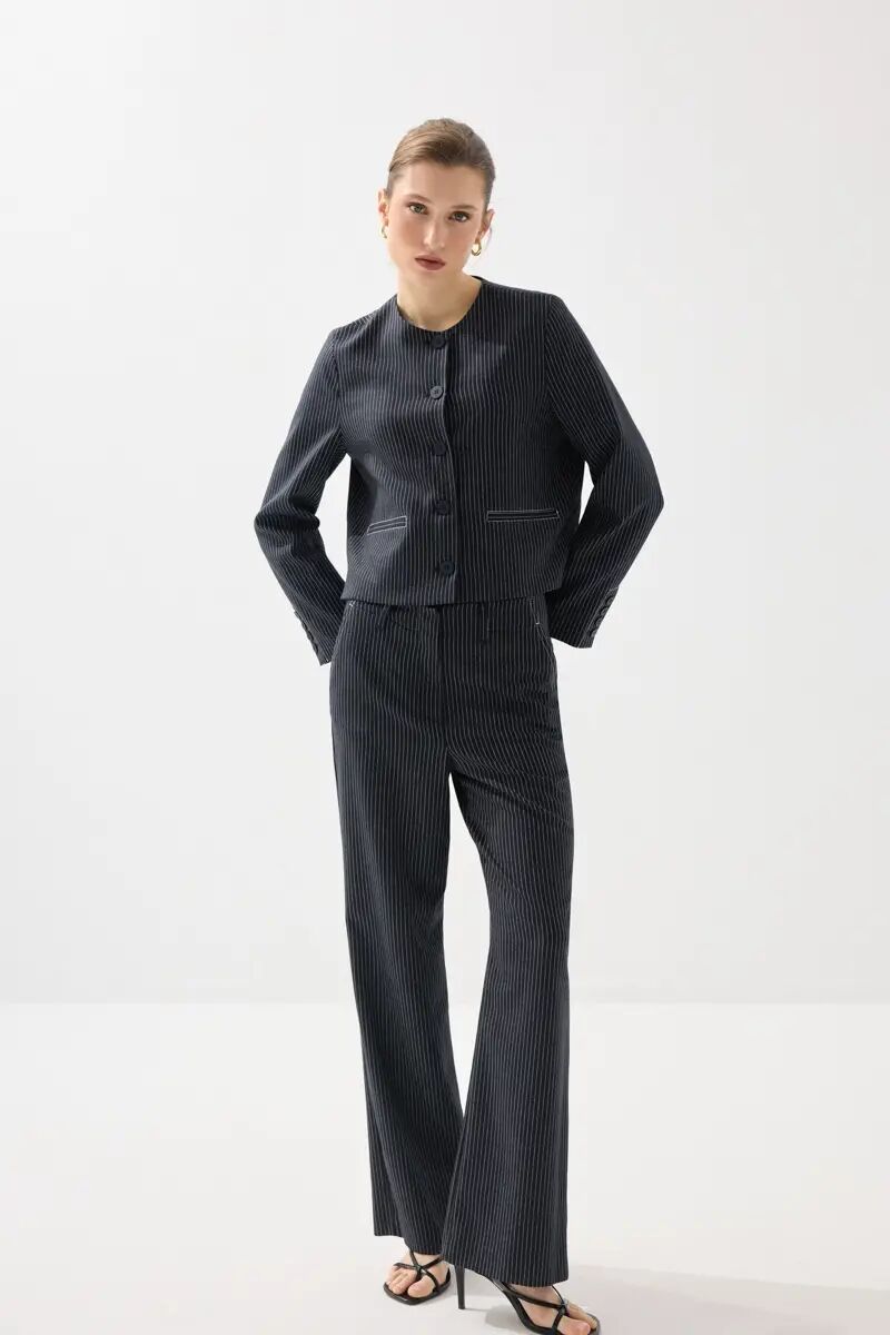 Sıfır Yaka Çizgili Viskon Keten Ceket - Lacivert
