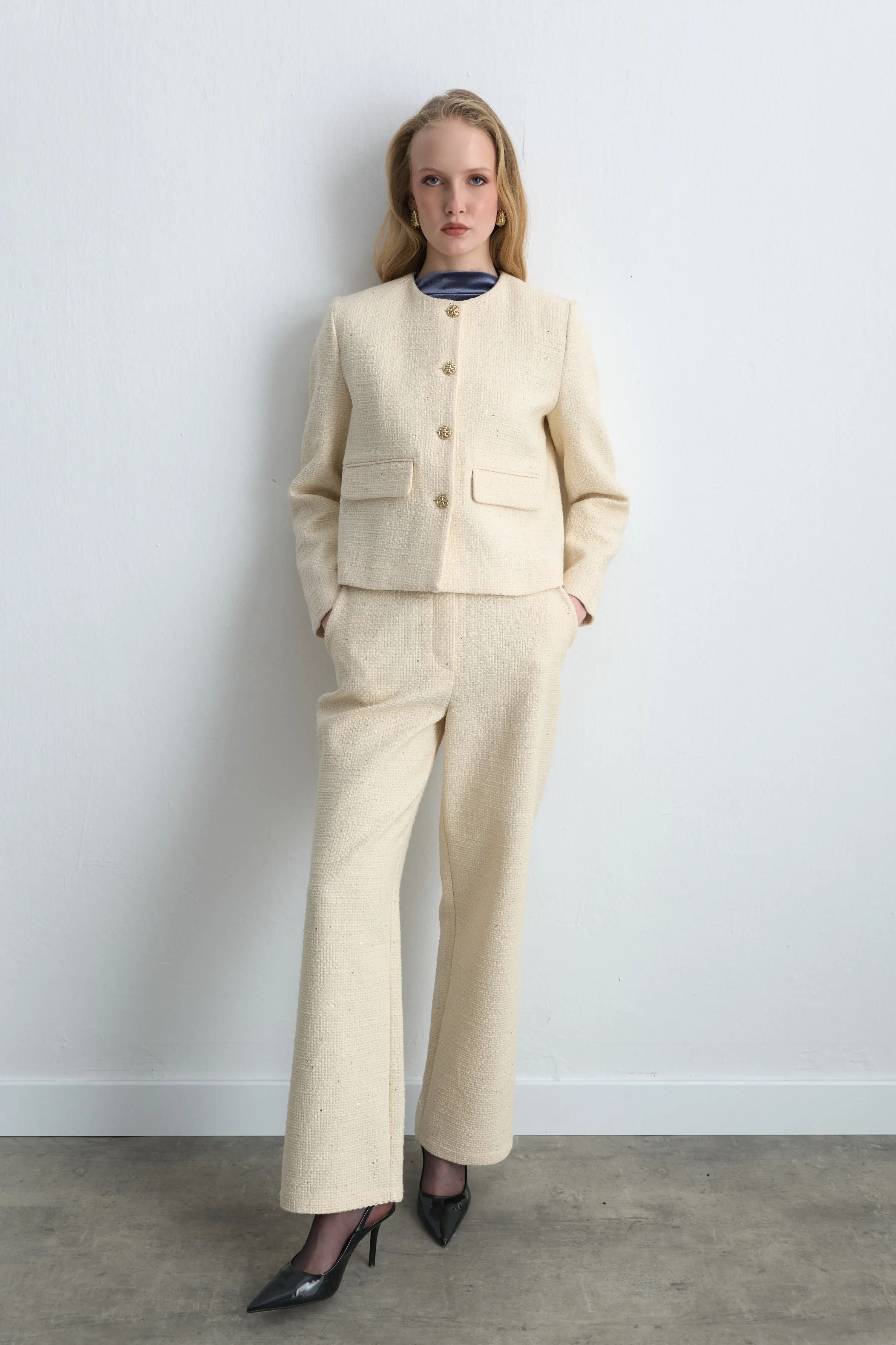 Sıfır Yakalı Tuvit Ceket & Boru Paça Pantolon - Ekru Takım