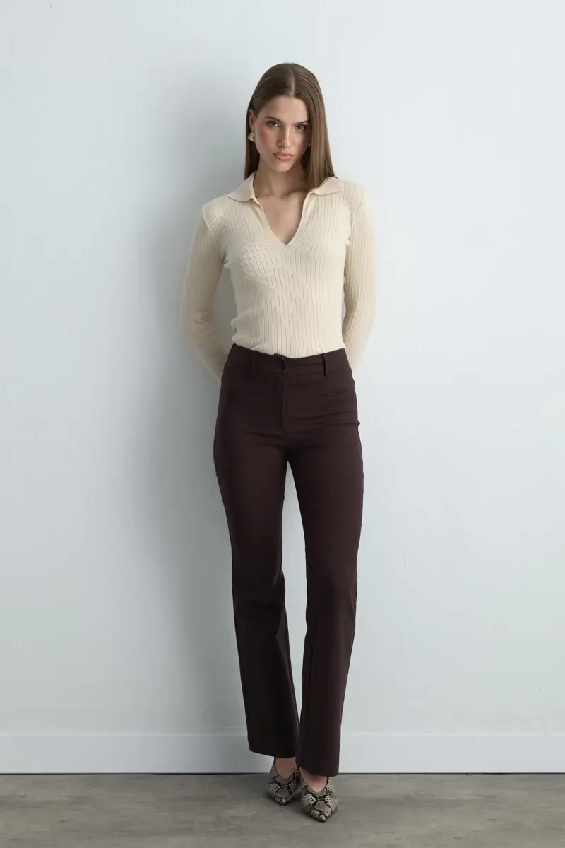 Modern flare kesimiyle silüeti zarifçe öne çıkarır. Kahverengi tonu hem resmi hem casual kombinlerde rahatlıkla kullanılabilir. Esnek dokusu konforu artırırken şıklığı da ön planda tutar. Blazer ceketlerle kusursuz bir bütünlük sağlar.