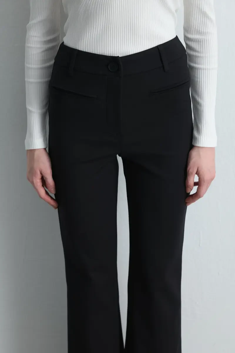 Flare kesimiyle bacak boyunu uzun gösterir. Esnek yapısı sayesinde rahat ve şık bir kullanım sunar. Siyah rengi zamansız bir alternatif oluşturur. Hem gömleklerle ofis stiline hem de bluzlarla akşam kombinlerine uyum sağlar.