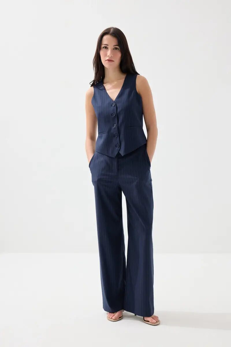 Silik Çizgili Klasik Yelek & Bol Paça Kumaş Pantolon Takım - Lacivert