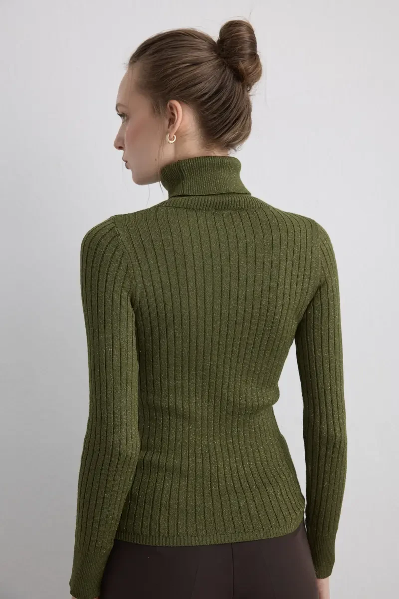 It offers a radiant look with the elegance of a natural tone. The shimmering knit texture creates a modern effect, while the turtleneck cut provides an elegant silhouette. Combines comfort and style on cold days.
