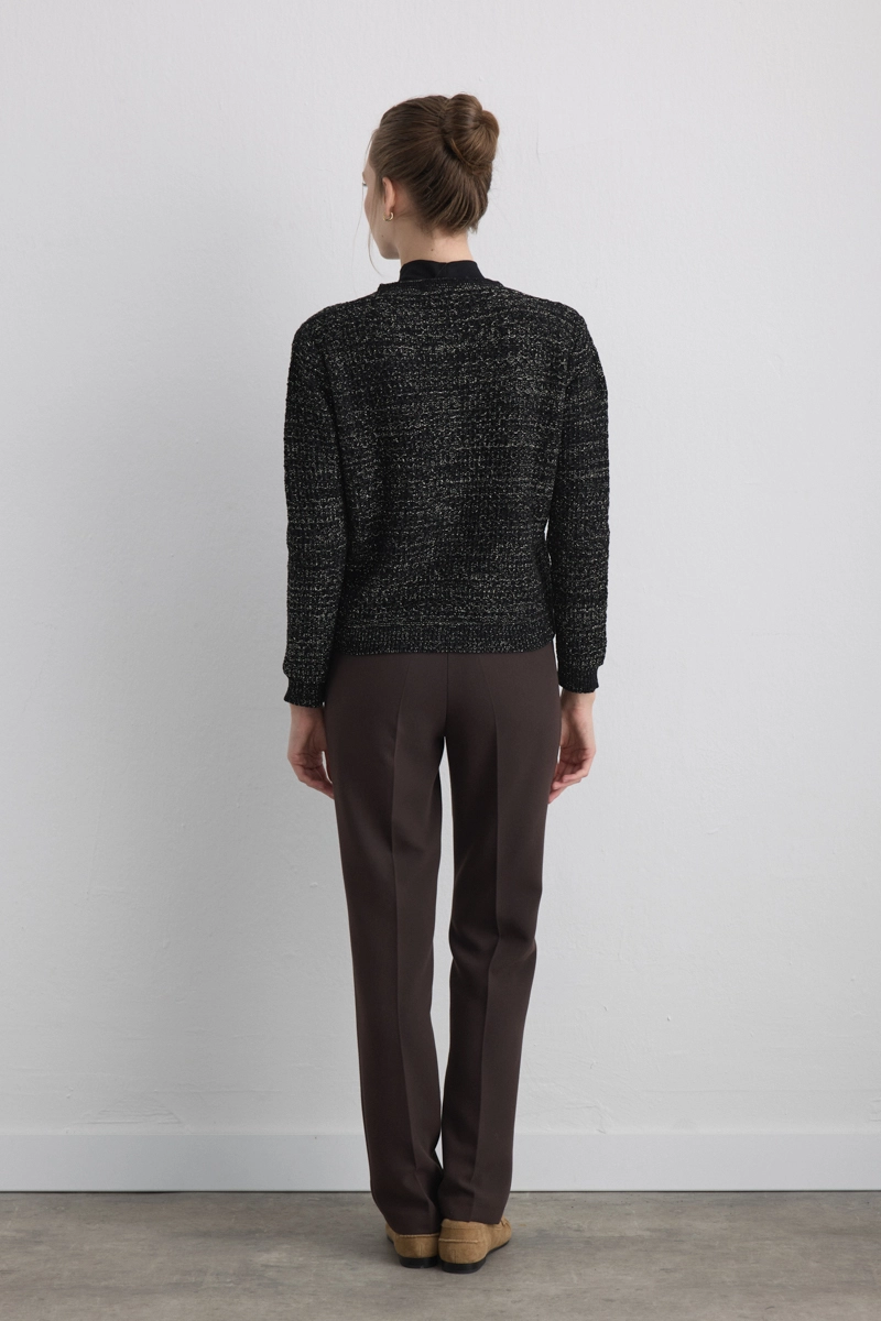 Glittery chenille threads reflect light with every movement. The relaxed fit and soft texture provide comfort. Suitable for both casual and evening outfits.