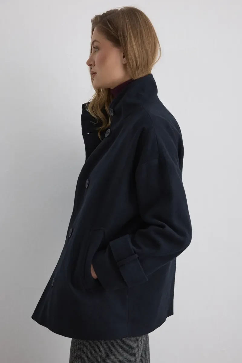 The stand collar cut presents a modern look. Its wool-blend texture provides warmth, while the navy tone reflects classic elegance. It stands out as a key piece for transitional seasons.