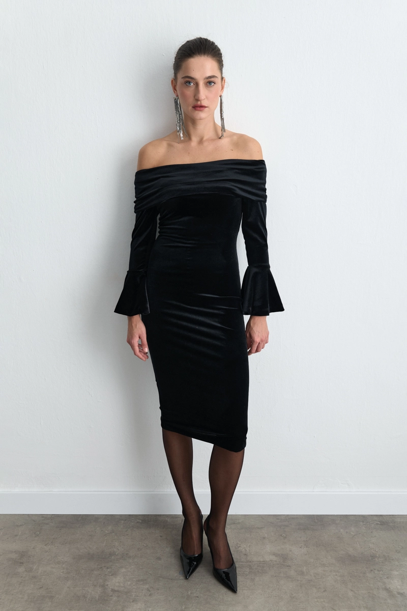 Siyah kadife dokusu şıklığı ve zarafeti bir araya getirir. Straplez kesimi feminen bir siluet oluşturur. Midi boyu modern bir denge sunar. Özel davetlerde zarif ve iddialı bir görünüm kazandırır. Minimal detaylarıyla sade ama etkileyici bir stil yaratır.