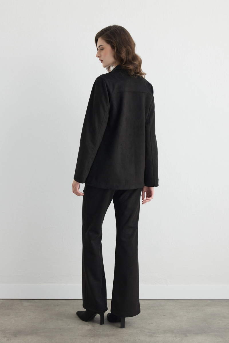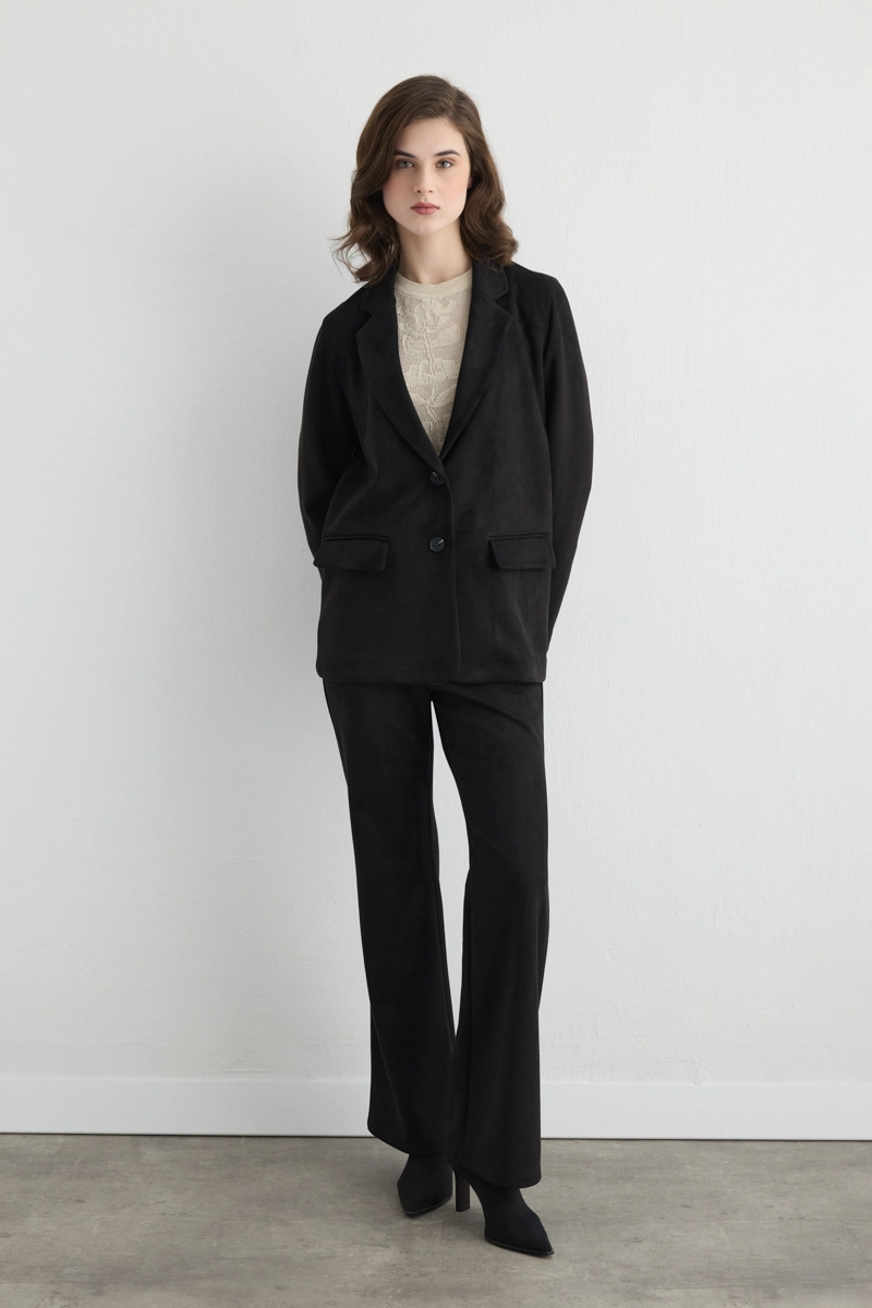 Siyah süet dokusu sofistike ve modern bir etki yaratıyor. Blazer kesim duruşa ciddi ve şık bir hava katıyor. Günlük veya iş kombinlerinde stilin odak noktası oluyor. Minimal detaylar ile elegant bir görünüm sağlanıyor. Farklı alt parçalarla kolayca kombinlenebiliyor. Şehirli ve güncel bir stil yaratıyor.