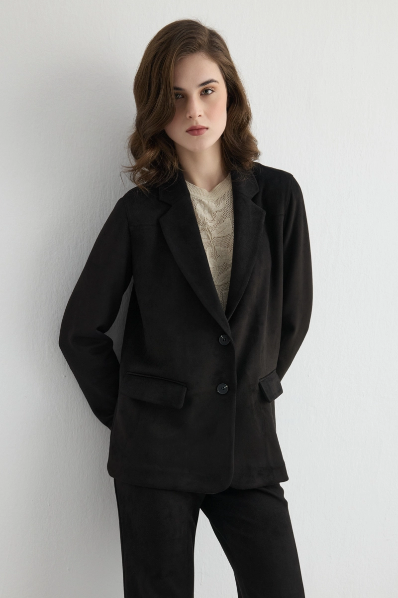 Siyah süet dokusu sofistike ve modern bir etki yaratıyor. Blazer kesim duruşa ciddi ve şık bir hava katıyor. Günlük veya iş kombinlerinde stilin odak noktası oluyor. Minimal detaylar ile elegant bir görünüm sağlanıyor. Farklı alt parçalarla kolayca kombinlenebiliyor. Şehirli ve güncel bir stil yaratıyor.