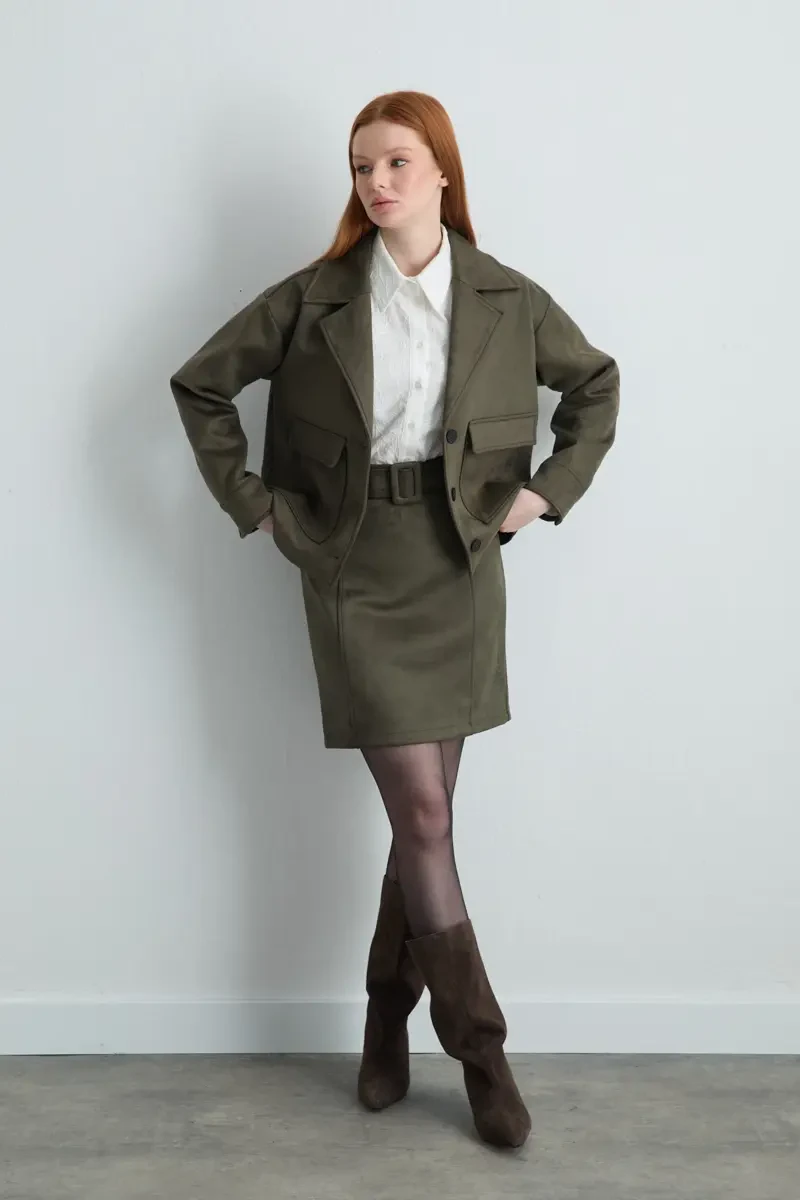 Modern şehir stilinin vazgeçilmezi olan haki süet mini etek, sade tasarımıyla çok yönlü bir kullanıma sahiptir. Süet dokusu lüks bir his verirken, kısa formu genç ve dinamik bir görünüm kazandırır. Kazaklar, gömlekler veya ceketlerle şık bir şekilde tamamlanabilir.