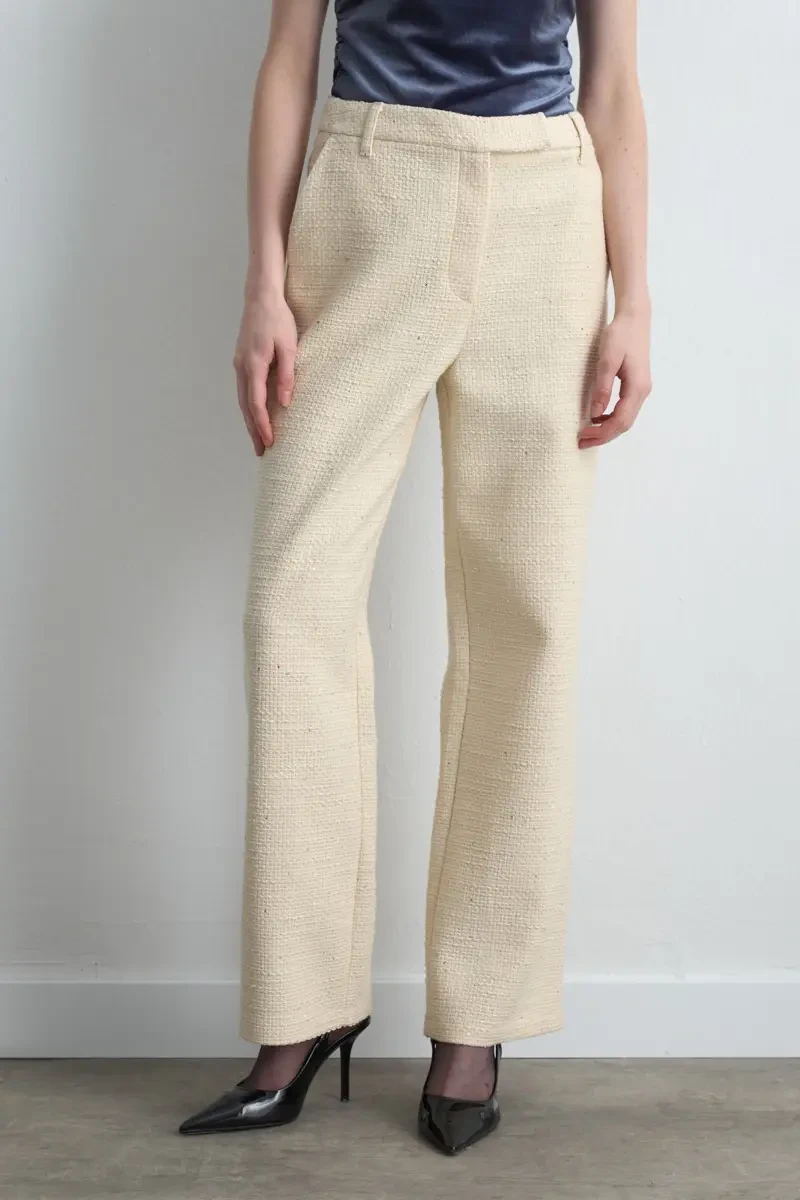 These trousers in ecru with tweed fabric blend classic style with modern touches. The straight-leg cut offers both elegance and balance. Can be worn with shirts and blazers for work outfits or stand out in casual chic ensembles. Adds a sophisticated touch to your wardrobe.