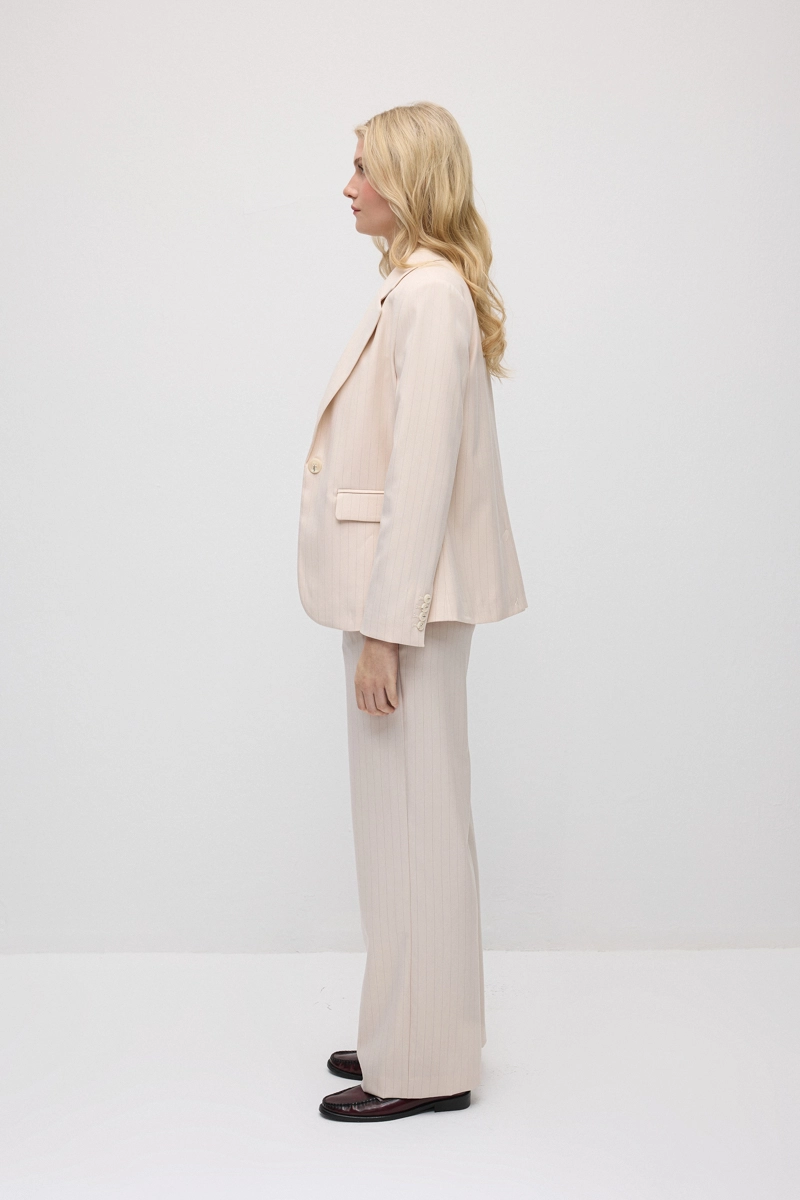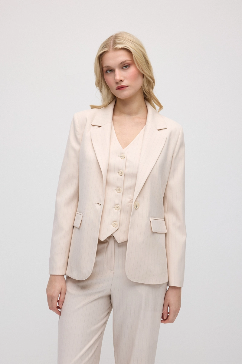 Tek düğmeli tasarımı ve silik çizgi deseniyle zarif ve modern bir görünüm sunar. Blazer kesimi stil sahibi ve dengeli bir siluet oluşturur. Günlük stilin yanı sıra şık kombinlerde de tercih edilebilir. Farklı parçalarla kolayca uyum sağlar. Yumuşak tonu stilinize feminen bir dokunuş katar.