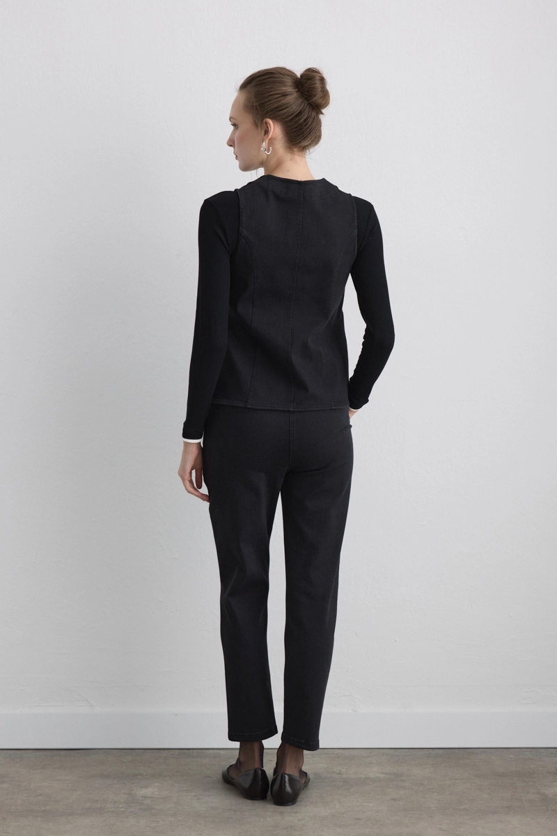 Minimal tasarımıyla şık bir tamamlayıcıdır. Siyah tonu birçok stile uyum sağlar. Hafif dokusu konforlu kullanım imkânı tanır. Modern kesimi katmanlı kombinlere şıklık katar. Denim dokusuyla günlük stilin parçası olur.