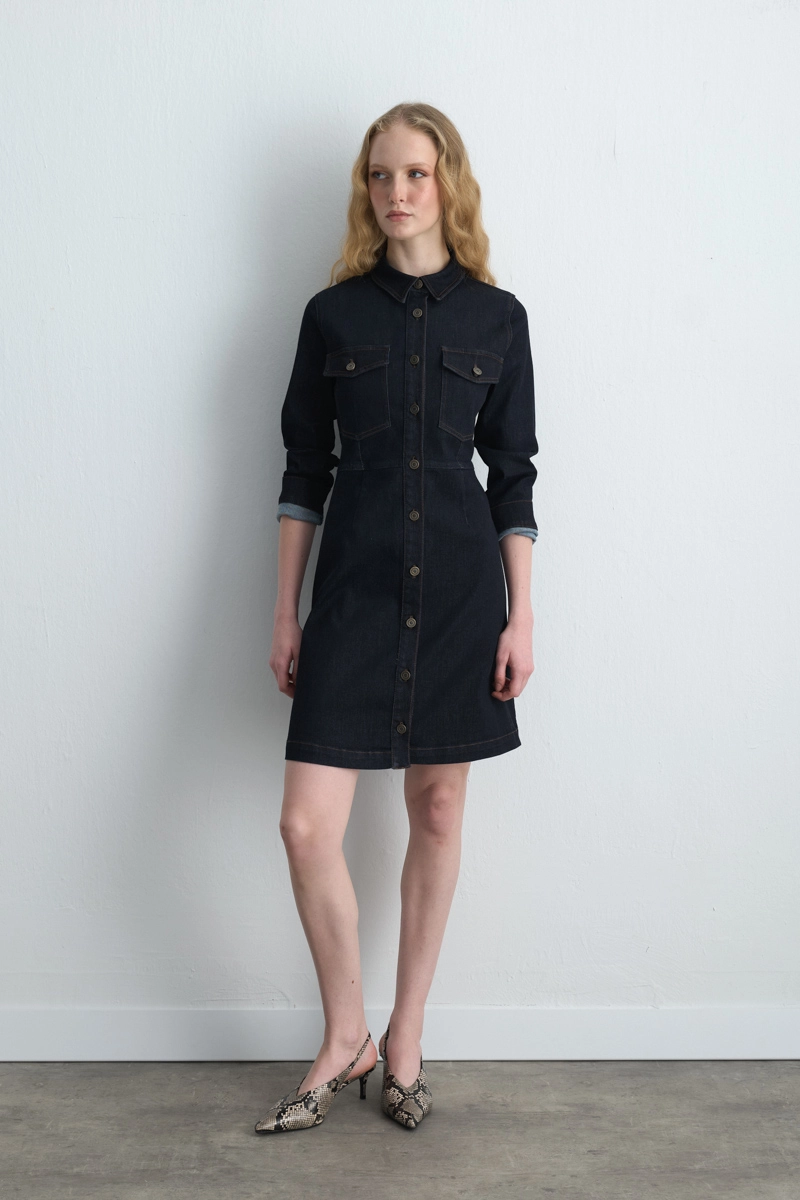 Tencel dokusu hafif ve nefes alabilen bir konfor sunar. Denim görünümü modern bir hava kazandırır. Lacivert tonu sofistike bir şıklık sağlar. Günlük şıklık için zarif bir alternatiftir.
