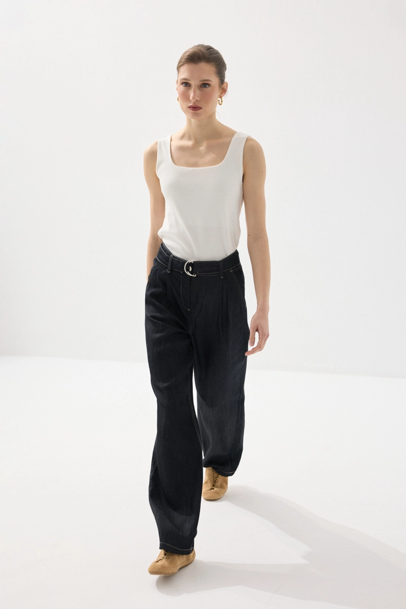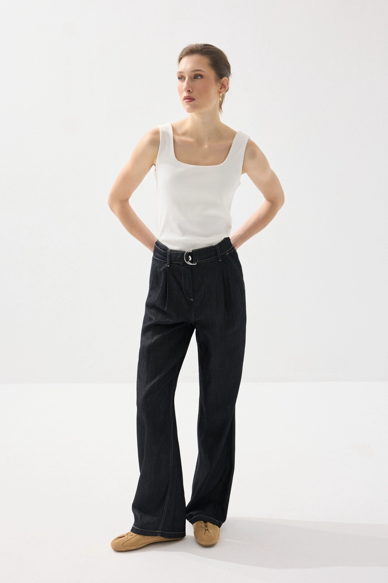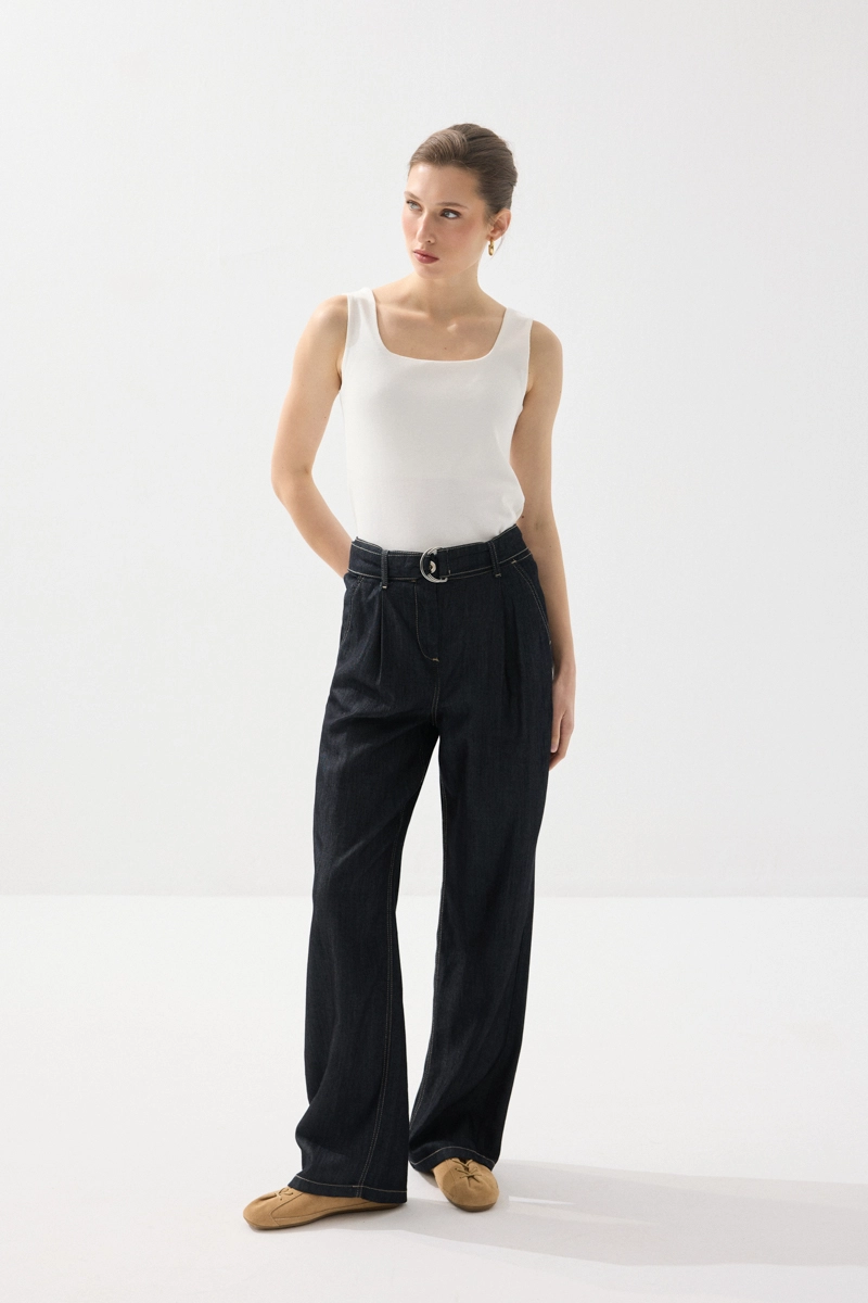 Yumuşak dokusuyla konforlu bir kullanım sunan bu tasarım, modern stilin anahtar parçalarından biridir. Denim görünümüyle zamansız bir şıklık sağlar. Kemer detayı, vücut formunu dengeli şekilde öne çıkarır. Lacivert tonu, farklı kombinlerle uyum yakalar. Günlük stil için ideal bir tercihtir.