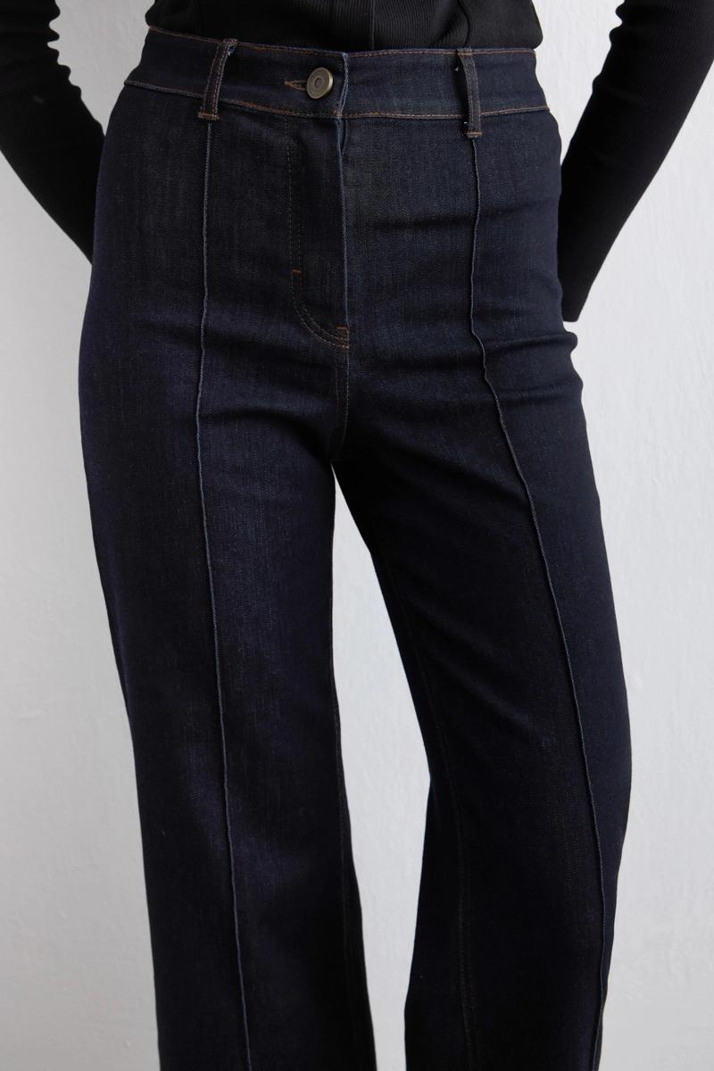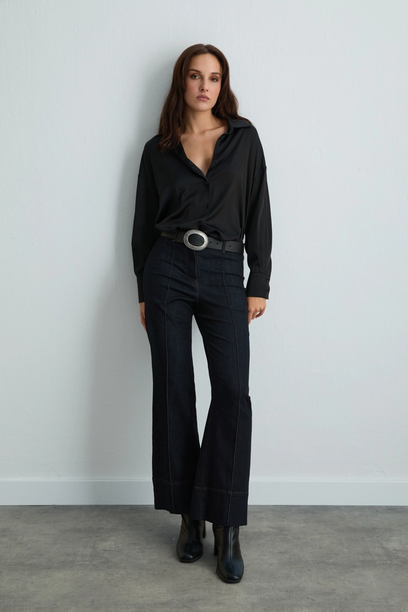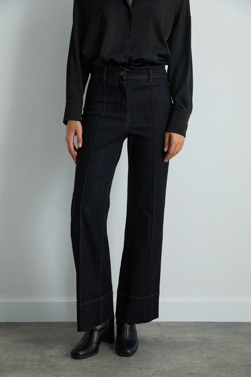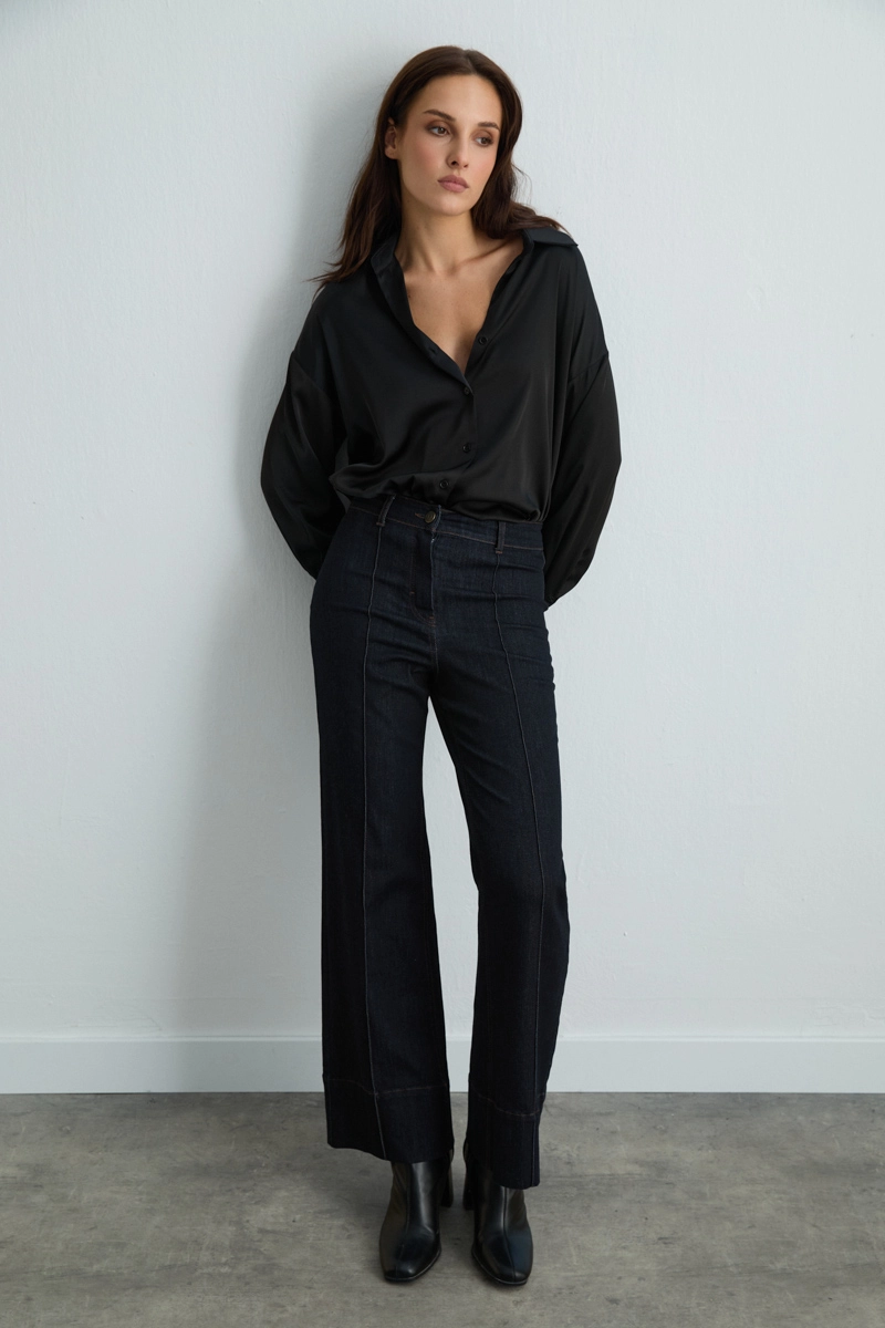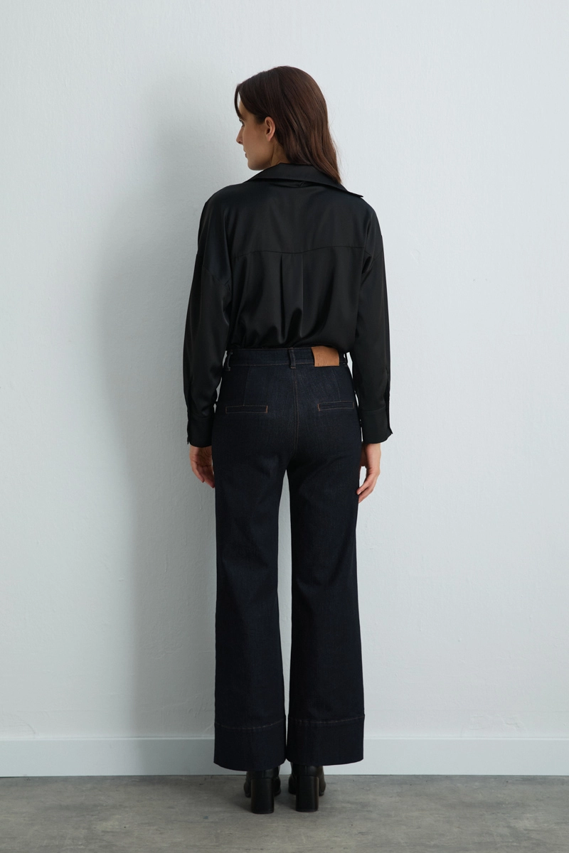 Geniş paça tasarımı rahat bir siluet oluşturur. Tencel denim yapısı yumuşak ve konforludur. Lacivert rengi kombinlerde kolaylık sağlar. Hem günlük hem şık kombinlerde kullanılabilir. Minimal detaylarla modern bir stil sunar.
