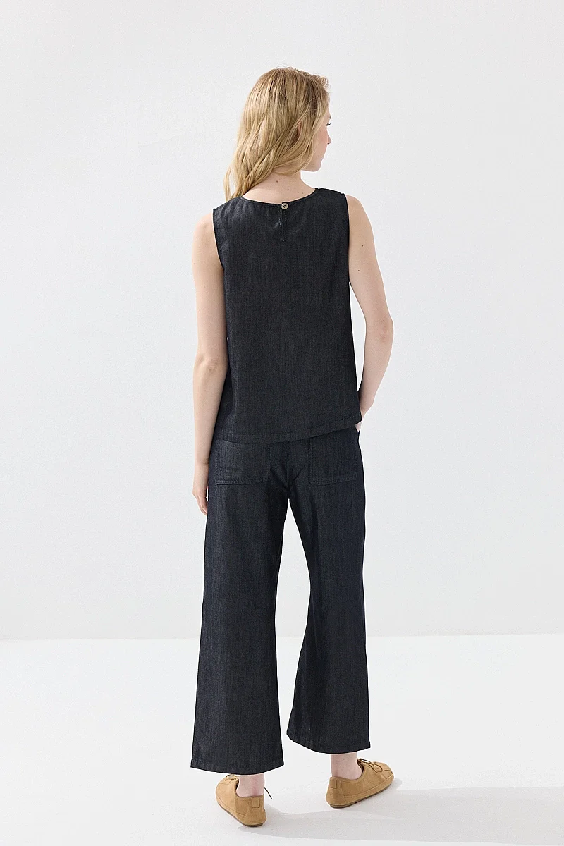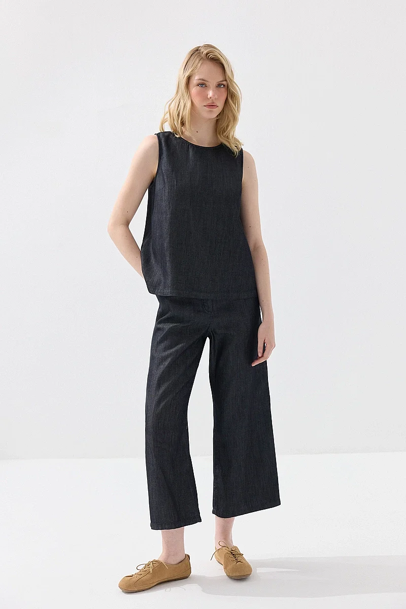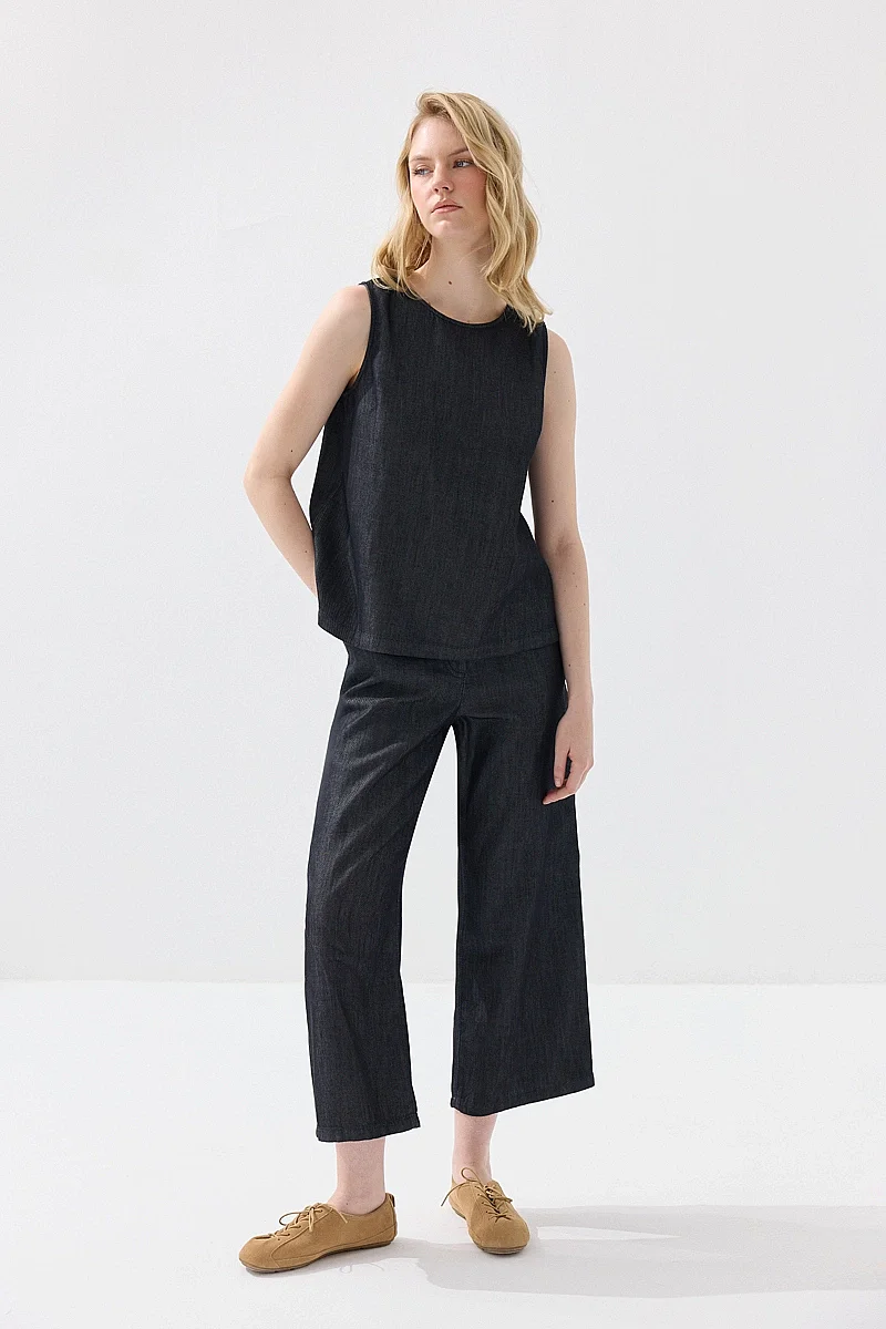Yumuşak dokusuyla konforlu bir kullanım sunan bu tasarım, modern bir stil oluşturur. Kolsuz kesimi sayesinde yaz aylarında ferah bir tercih sağlar. Denim görünümüyle zamansız bir şıklık sunar. Lacivert tonu ile farklı kombinlere kolayca uyum sağlar. Günlük stilin sade ama etkili parçalarından biridir.