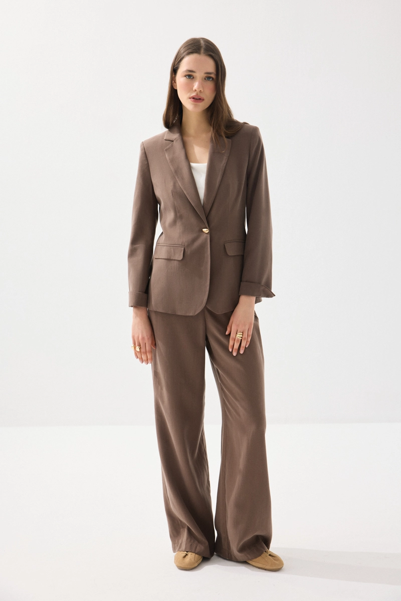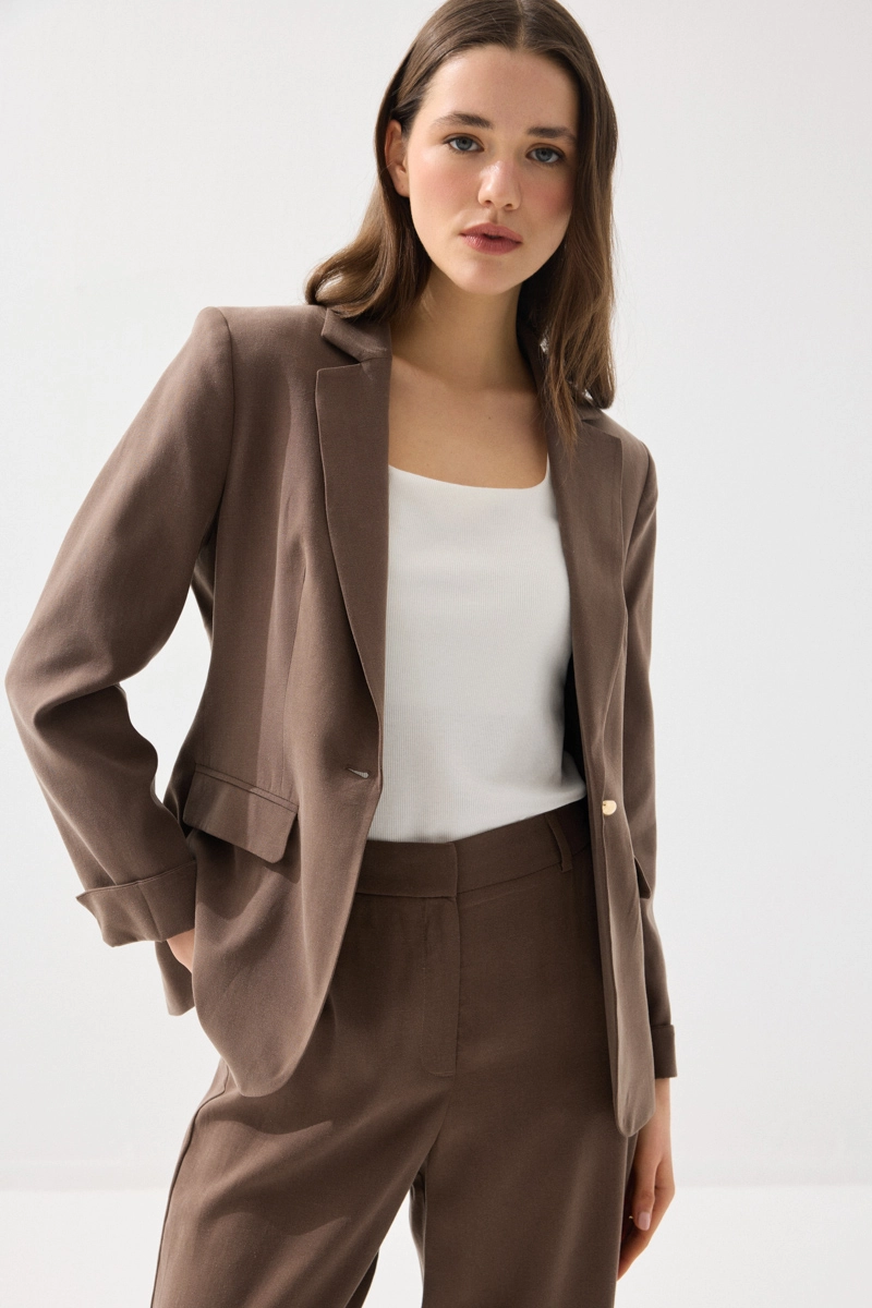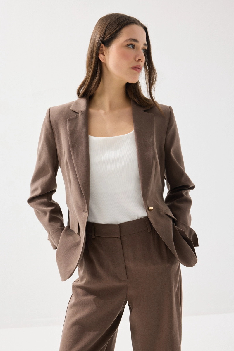 Doğal dokusuyla öne çıkan bu tasarım, sade ve şık bir görünüm sunar. Nefes alabilen yapısı sayesinde konforlu bir kullanım sağlar. Tek düğmeli kesimi, modern ve minimal bir stil oluşturur. Kahverengi tonlarıyla kombinlere sıcak bir hava katar. Günlük ve klasik kombinlerle uyumlu bir tamamlayıcıdır.