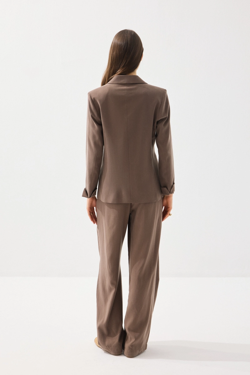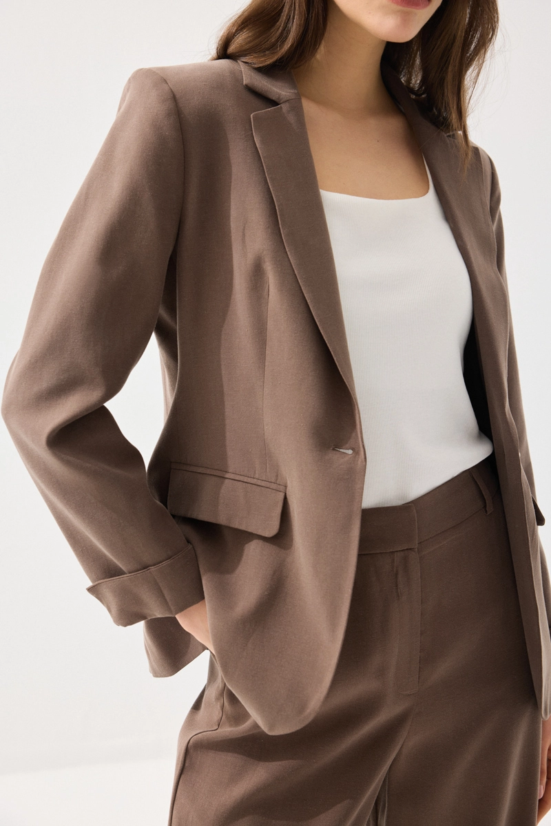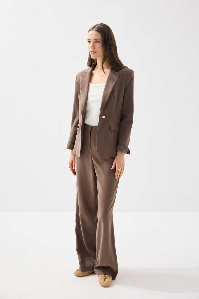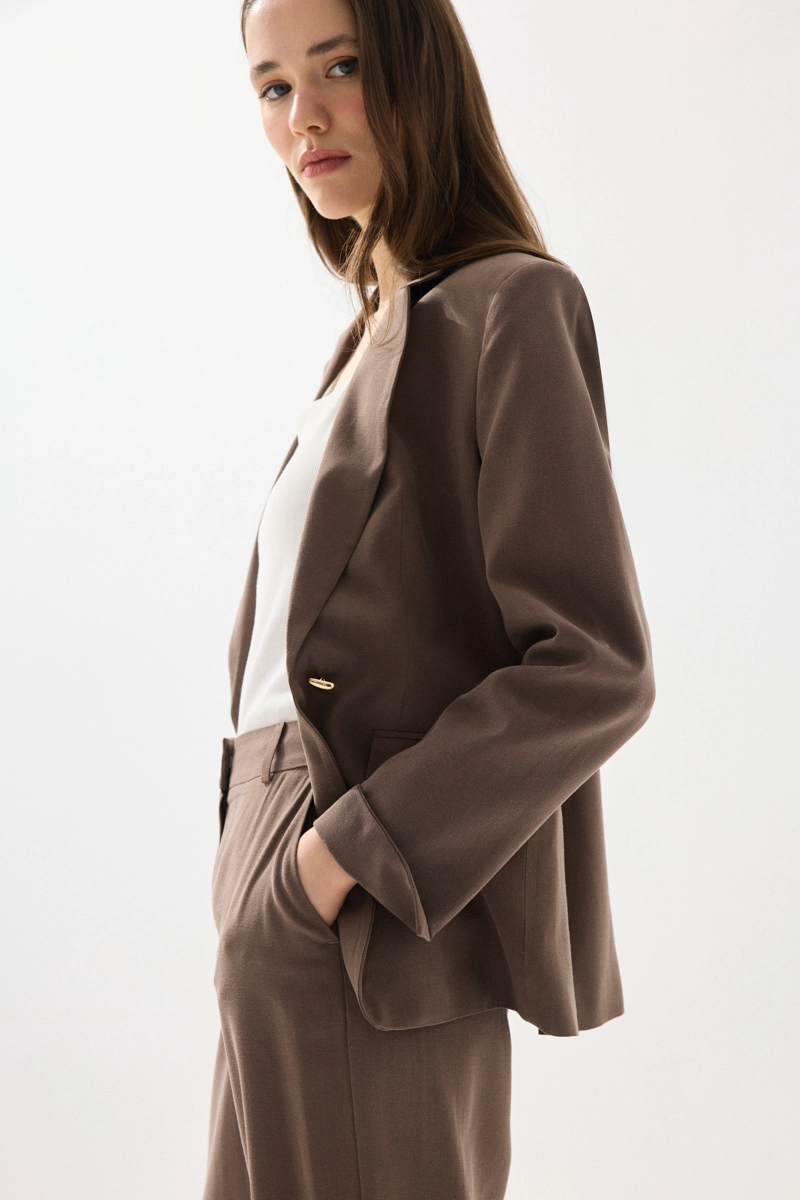 Doğal dokusuyla öne çıkan bu tasarım, sade ve şık bir görünüm sunar. Nefes alabilen yapısı sayesinde konforlu bir kullanım sağlar. Tek düğmeli kesimi, modern ve minimal bir stil oluşturur. Kahverengi tonlarıyla kombinlere sıcak bir hava katar. Günlük ve klasik kombinlerle uyumlu bir tamamlayıcıdır.