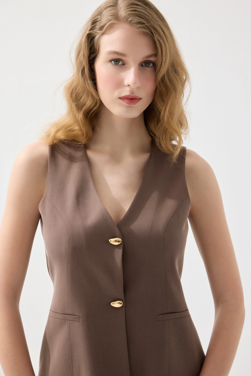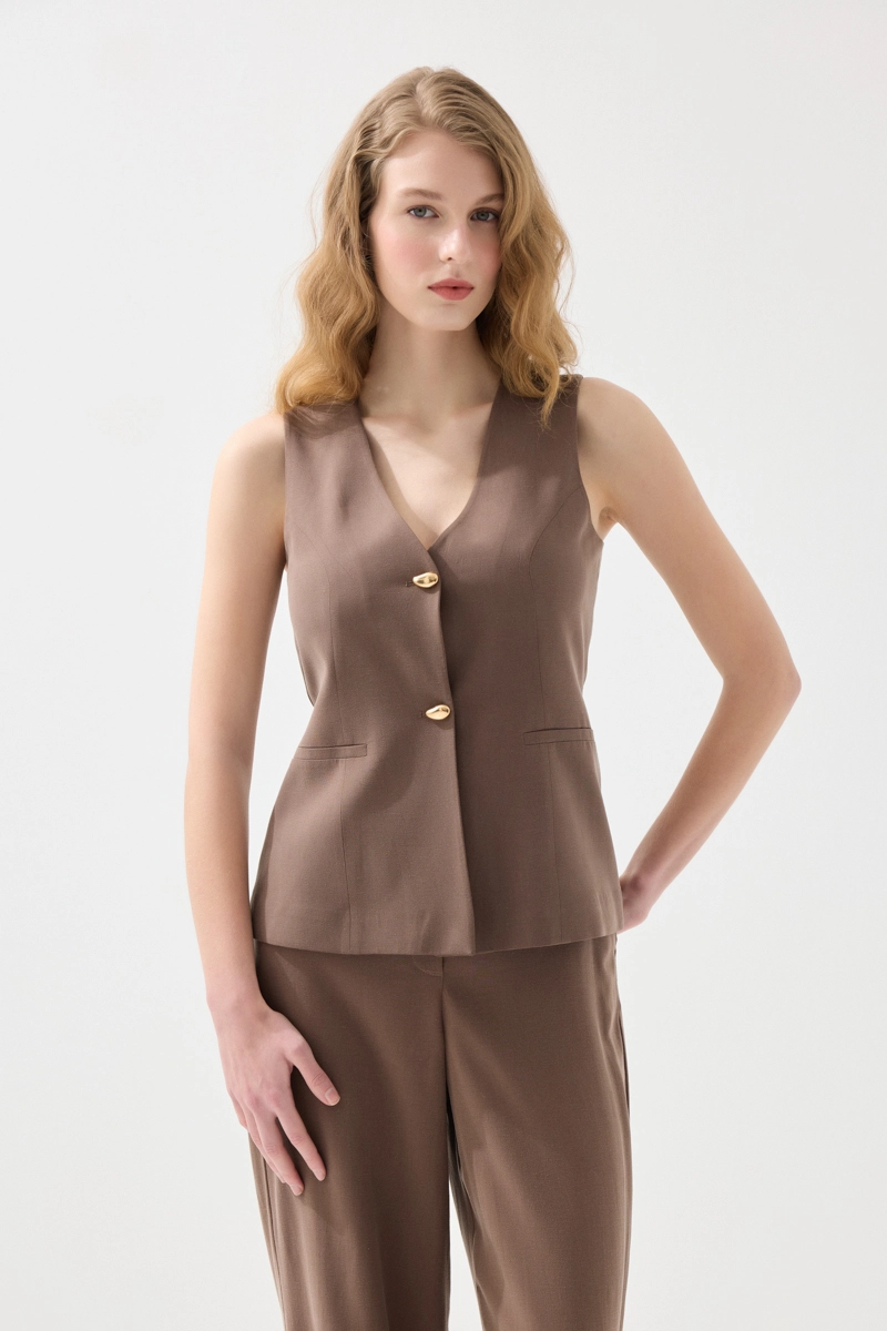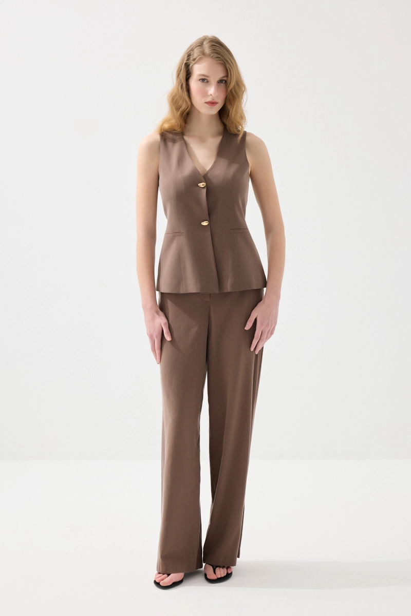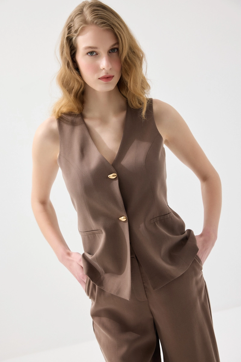 Doğal kumaş yapısıyla hafif ve konforlu bir kullanım sunar. Kahverengi tonlarıyla sıcak ve dengeli bir görünüm oluşturur. Katmanlı kombinlerde şık bir tamamlayıcı olarak öne çıkar. Modern kesimi sayesinde farklı stillerle uyum sağlar. Günlük ve klasik kombinler için ideal bir parçadır.