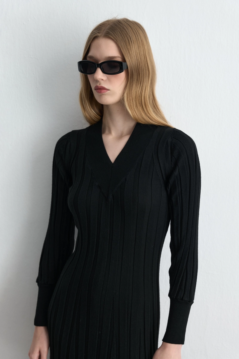 Siyah rengiyle klasik ve sade bir zarafet sunar. Fitilli triko dokusu vücut formunu zarifçe vurgular. Yün karışımı kumaş sıcaklık ve konfor sağlar. Minimal kesimi modern bir görünüm kazandırır. Günlük şıklıktan akşam stiline kolayca uyum sağlar.