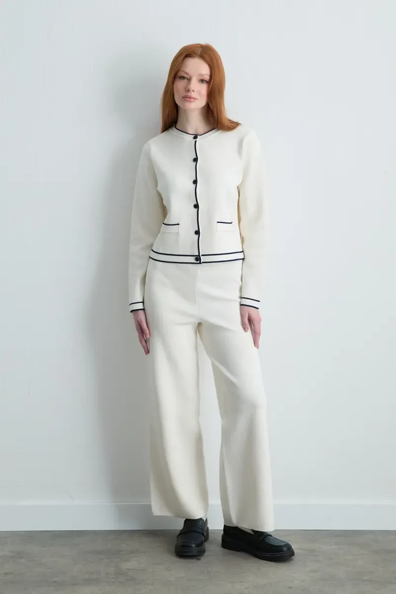 Ecru cardigan with trim details offers simple elegance. Its soft and lightweight fabric makes it an ideal complement for layered outfits. Easily styled with jeans or trousers for everyday use.