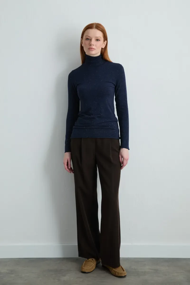 The turtleneck cashmere blouse, a winter essential, adds a modern sparkle to a classic style with its glittery texture. The navy tone offers a sophisticated look, making it a graceful choice for both office and special event outfits.