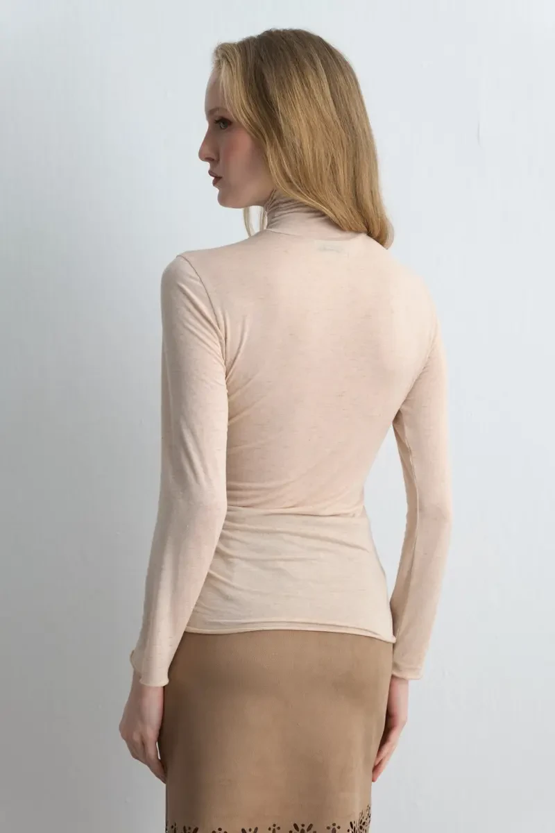 The ecru blouse with its shimmering texture stands out for special occasions, offering a sophisticated look with its turtleneck detail. The cashmere fabric ensures both elegance and comfort. Suitable for daily wear or event ensembles. When paired with delicate jewelry, it creates an impressive style.