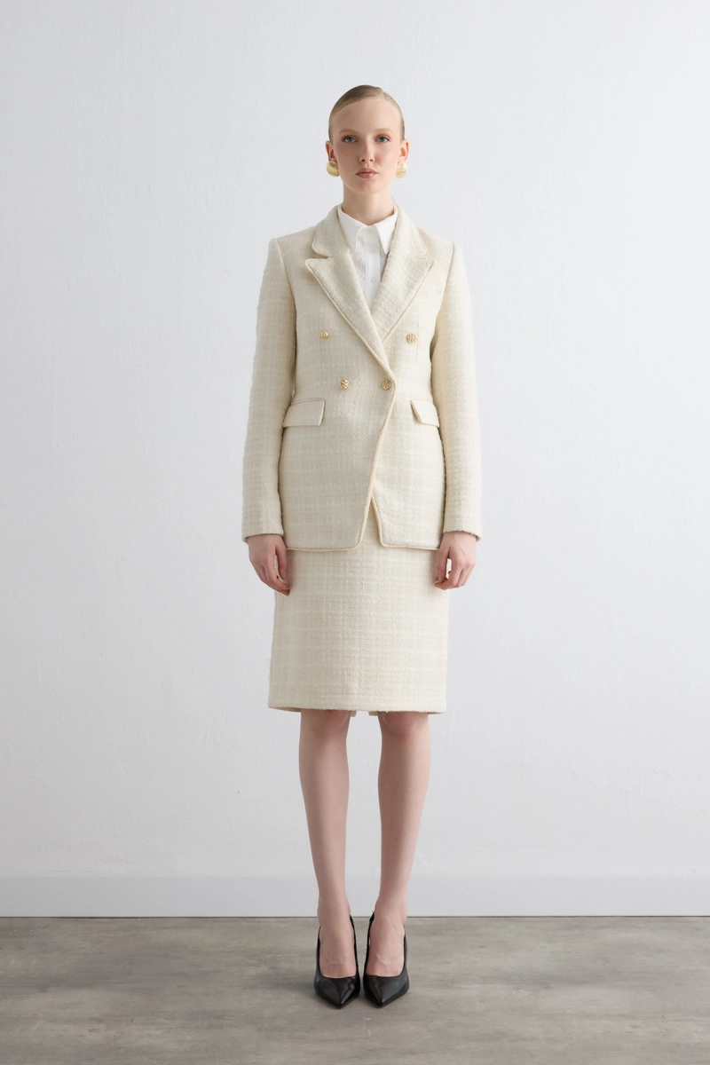 Zarif tüvit dokusu klasik ve feminen bir duruş sunar. Kalem formu şık bir siluet oluşturur. Ekru tonu sofistike kombinler için idealdir. Ofis ve özel davetlerde stilinizi öne çıkarır.
