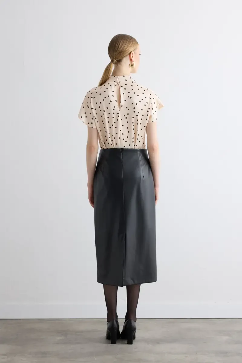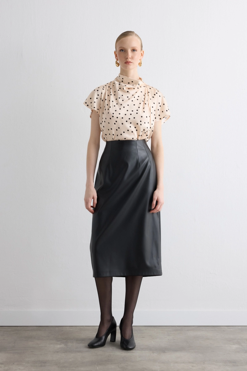 Modern ve güçlü bir tarz yansıtır. Deri dokusu iddialı bir görünüm kazandırır. Uzun formu feminen bir siluet oluşturur. Siyah tonu zamansız bir kullanım sunar. Hem gündüz hem gece kombinlerine kolayca uyum sağlar.