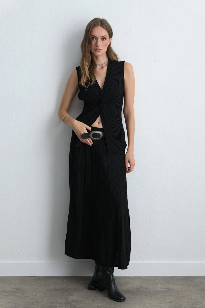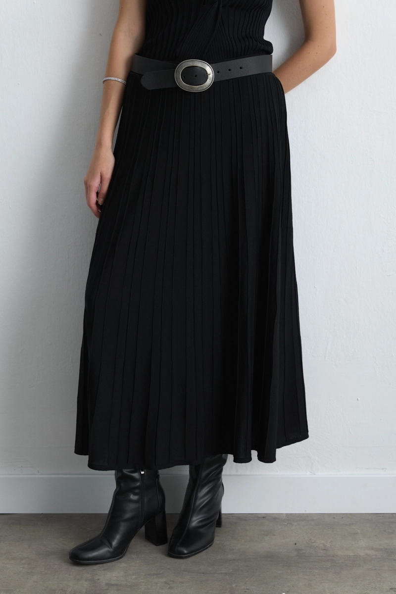 This black long knit skirt, accentuated with delicate pleated details, adapts to both classic and modern combinations. Its knit texture provides comfortable wear, while the long length creates a feminine stance. Can be styled with knit tops in winter or light blouses in summer for chic outfits.