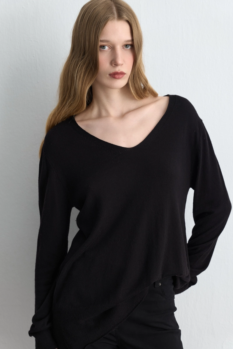 Yumuşak yün dokusuyla sıcak ve konforlu bir his verir. V yaka kesimi sade ama zarif bir görünüm kazandırır. Rahat formu günlük kombinlerde özgür bir hareket alanı sunar. Siyah tonu her stile uyum sağlayan klasik bir duruş oluşturur. Mevsim geçişlerinde şıklığı ve konforu bir arada sunar.