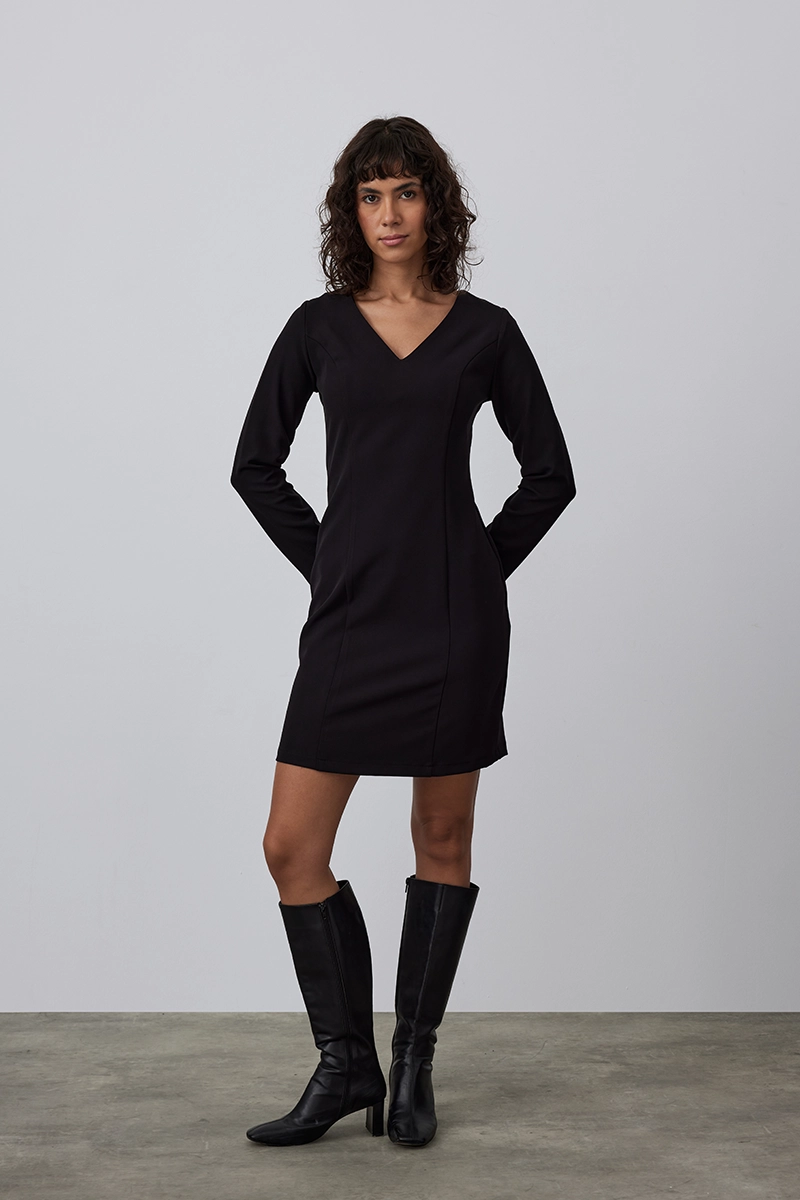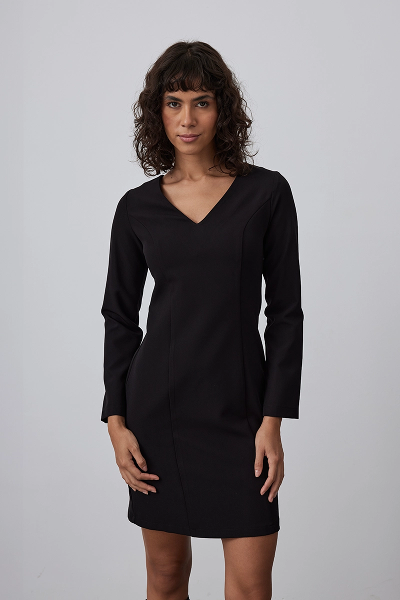 Siyah V yakalı likralı midi elbise, esnek yapısı ve sade tasarımıyla konforlu bir şıklık sunar. Gün boyu rahat bir kullanım sağlarken modern bir siluet oluşturur.