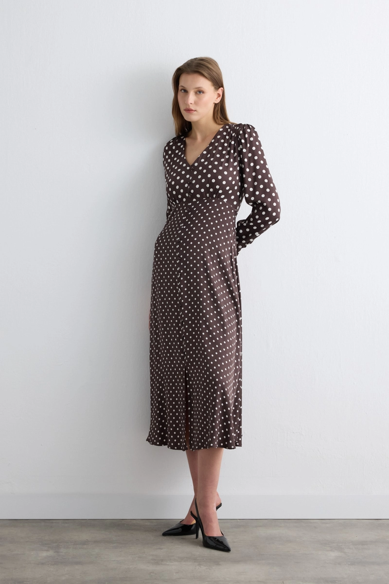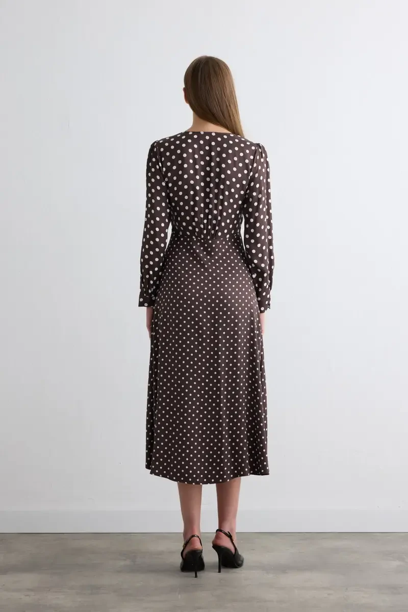 V yakası zarif bir siluet oluşturur. Puanlı deseni feminen ve hareketli bir hava katar. Akışkan viskon saten dokusu gün boyu konfor sağlar. Kahverengi tonu sıcak ve sofistike bir görünüm sunar. Uzun formu özel günlerden günlük şıklığa kadar farklı kombinlerde rahatlıkla tercih edilir.