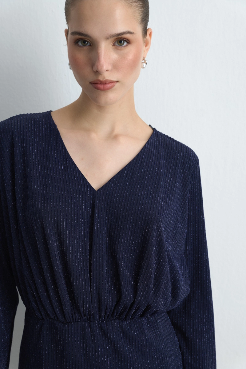 V yaka detayı zarif bir siluet oluşturur. Simli dokusu ışıkla parlayarak dikkat çeker. Lacivert tonu sofistike bir hava katar. Özel davetlerde şıklığı ön plana çıkarır.