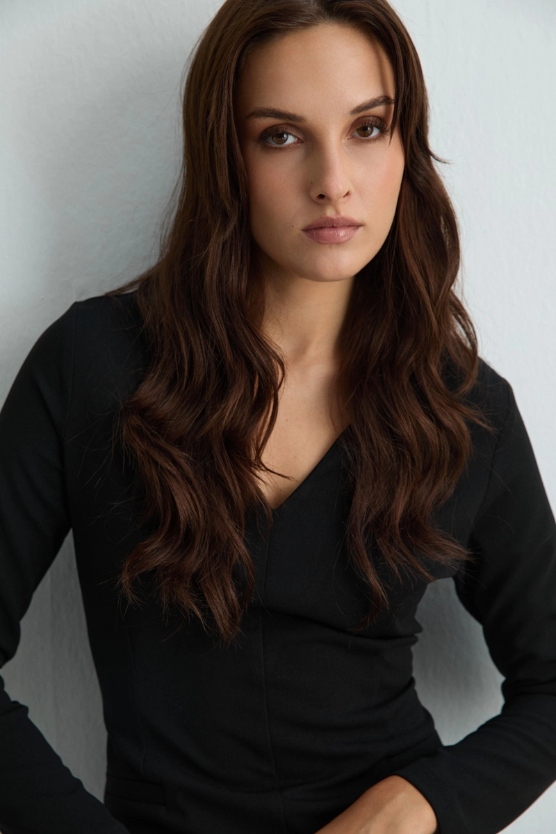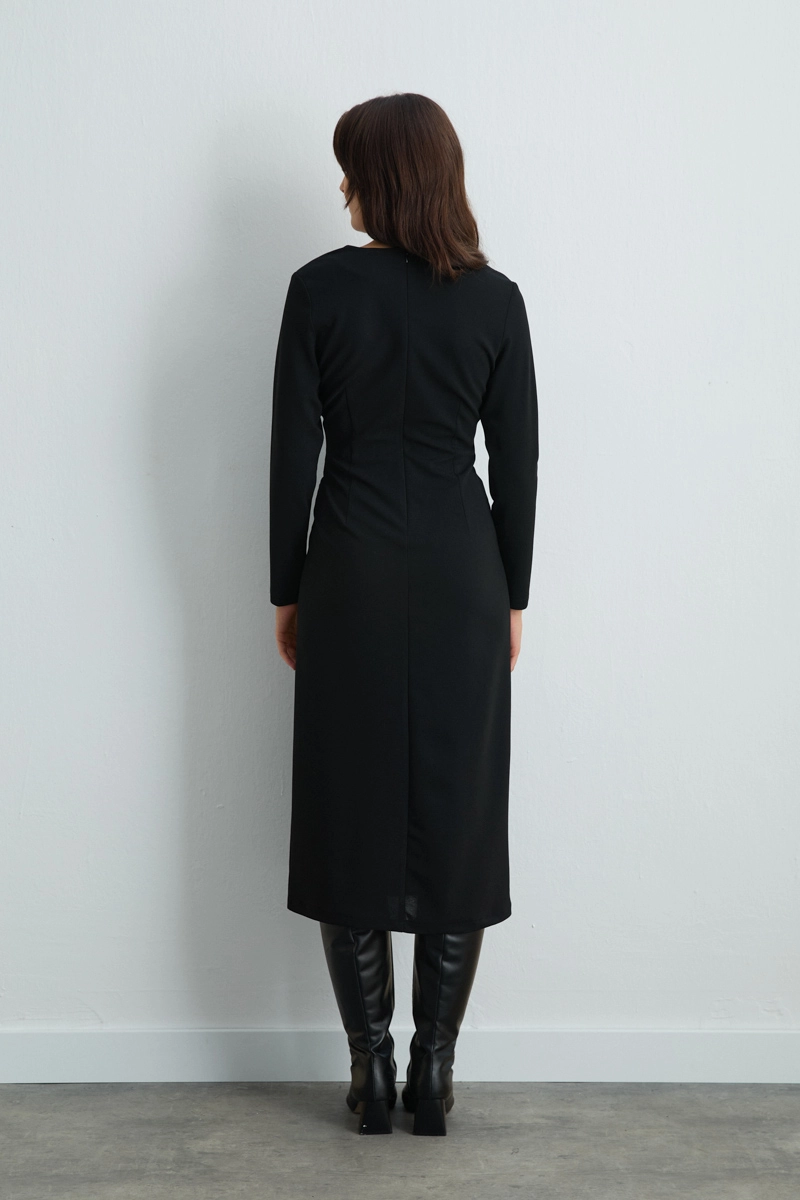 V yakasıyla zarif bir dekolte sunan siyah uzun elbise, lycralı esnek kumaşı sayesinde mükemmel bir kalıp oluşturur. Akıcı formu ve sade çizgileriyle gece davetlerinde ya da özel etkinliklerde dikkat çekici bir görünüm sağlar.