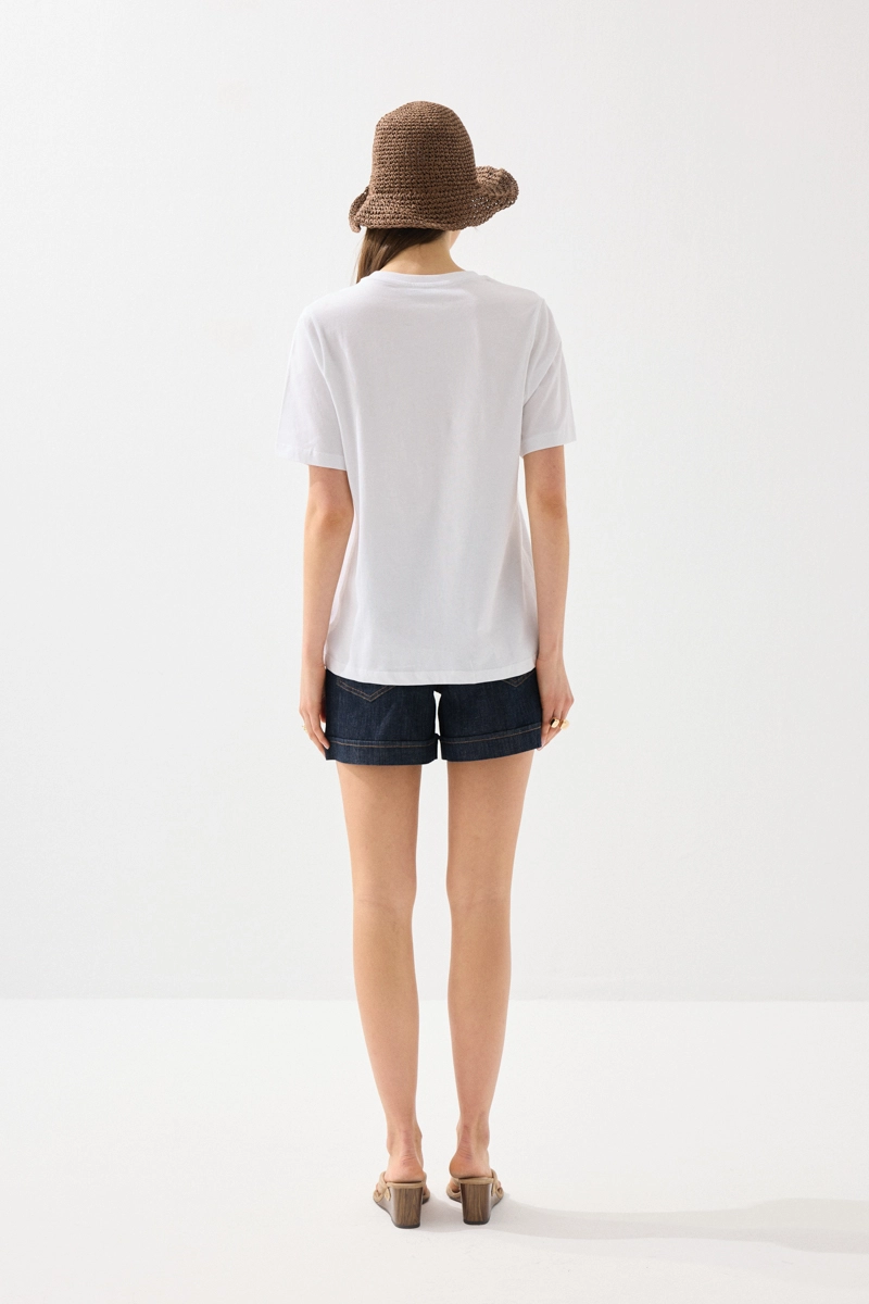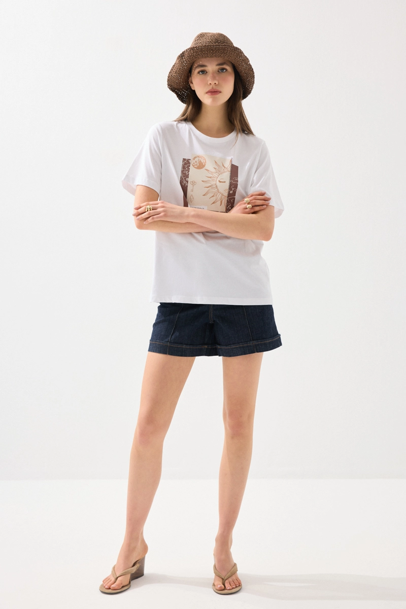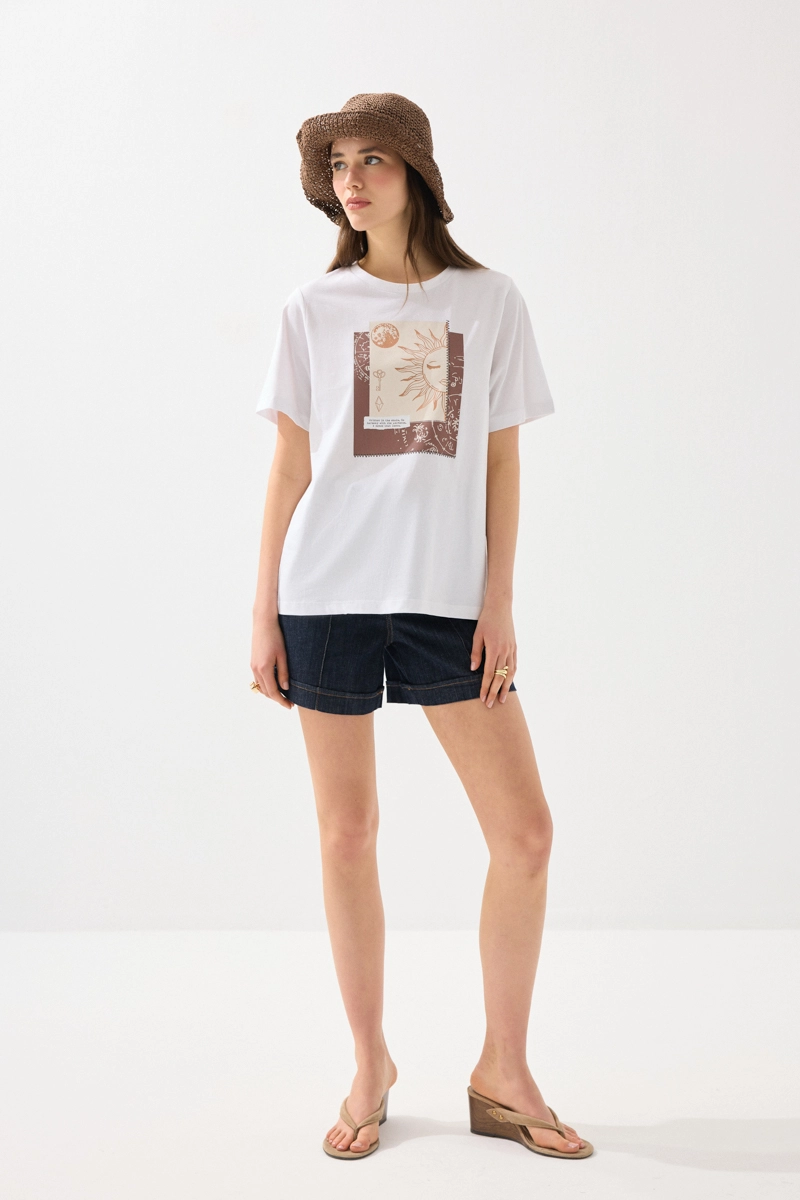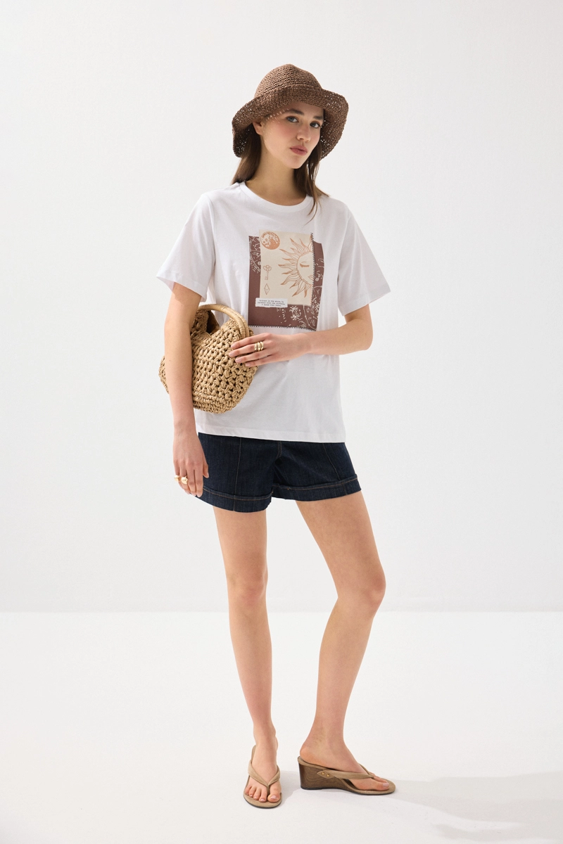 Sade tasarımı, dikkat çekici baskı detayıyla hareket kazanır. Pamuklu kumaşı sayesinde gün boyu konforlu kullanım sunar. Beyaz tonuyla ferah ve temiz bir görünüm sağlar. Günlük kombinlerde kolayca uyum yakalar. Modern ve rahat stilin tamamlayıcı parçalarından biridir.